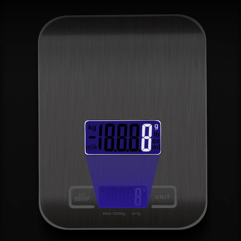-Емкость: 5000 г/1 г, 10000 г/1 г-Единицы измерения: g, lb, ml, oz-Дисплей: ЖК-дисплей с белой подсветкой-Нержавеющая сталь с защитой от отпечатков пальцев-Автоматическое отслеживание нулевой точки-Автоматическое выключение 2 минут