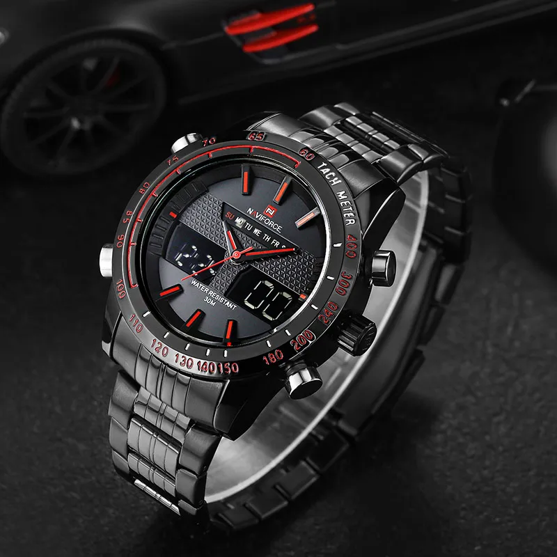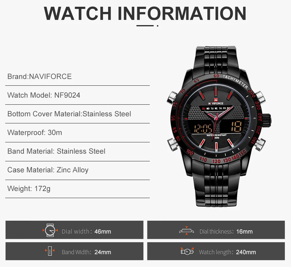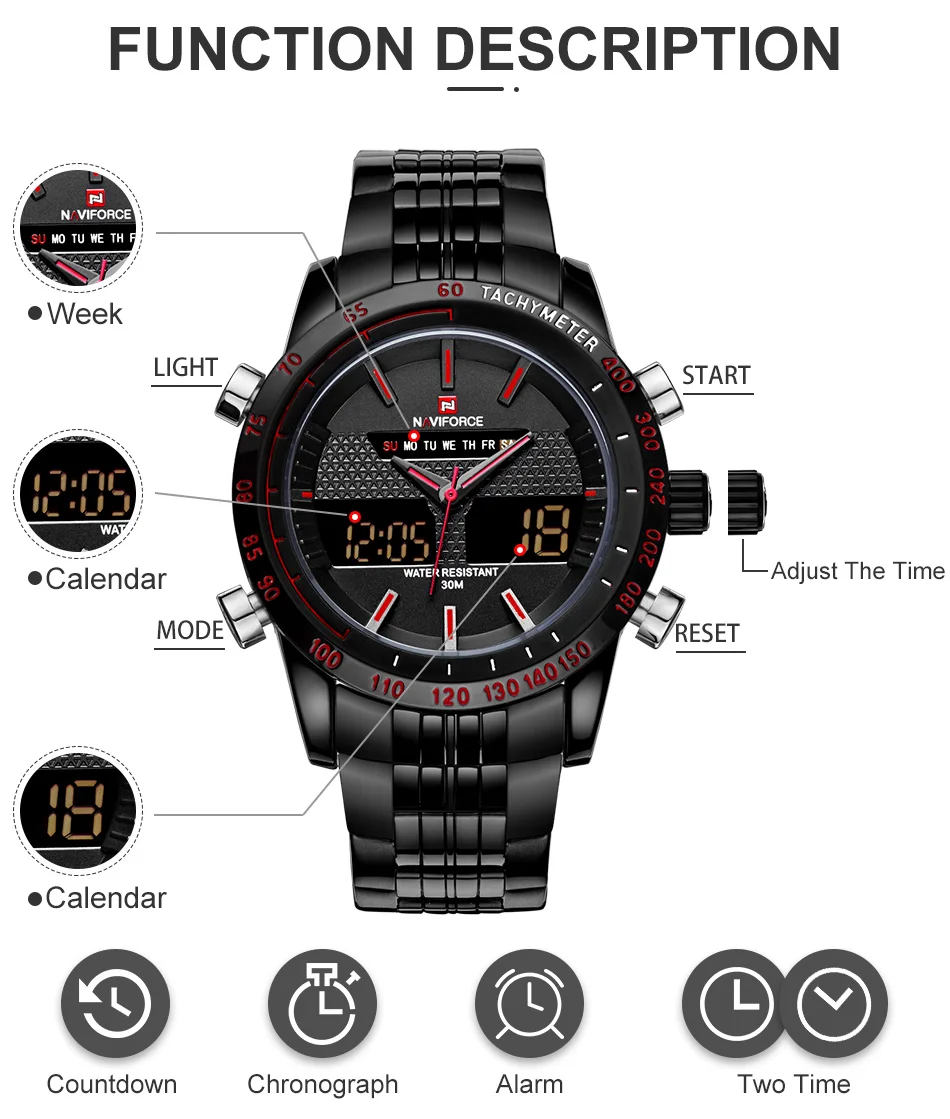 Механизм: кварцевый механизм + светодиодный дисплейПол: мужчин и женщинСтиль: Модный, Повседневный, СпортивныйМатериал циферблата: закалённое минеральное стеклоМатериал ремешка: ремешок из нержавеющей сталиТип застежки: складная застежка надежноДиаметр циферблата: 46 ммЧехол Толщина: 16 ммОбщая длина: 240 ммШирина ремешка: 24 ммВес изделия: 172 гХарактеристики: Водонепроницаемость до 30 м, отображение дня и даты, светящийся, хронограф, обратный отсчет, будильник