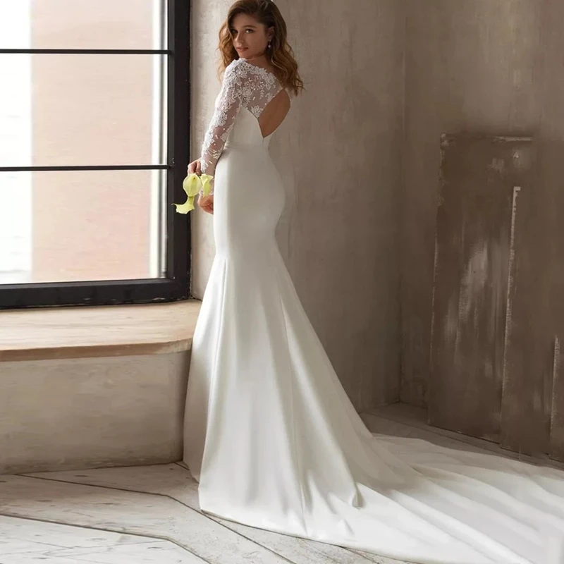 Кружевное свадебное платье с длинным рукавом и юбкой-годе, 2021, шикарное свадебное платье с вырезом лодочкой для женщин, сексуальное атласное платье с открытой спиной и пуговицами