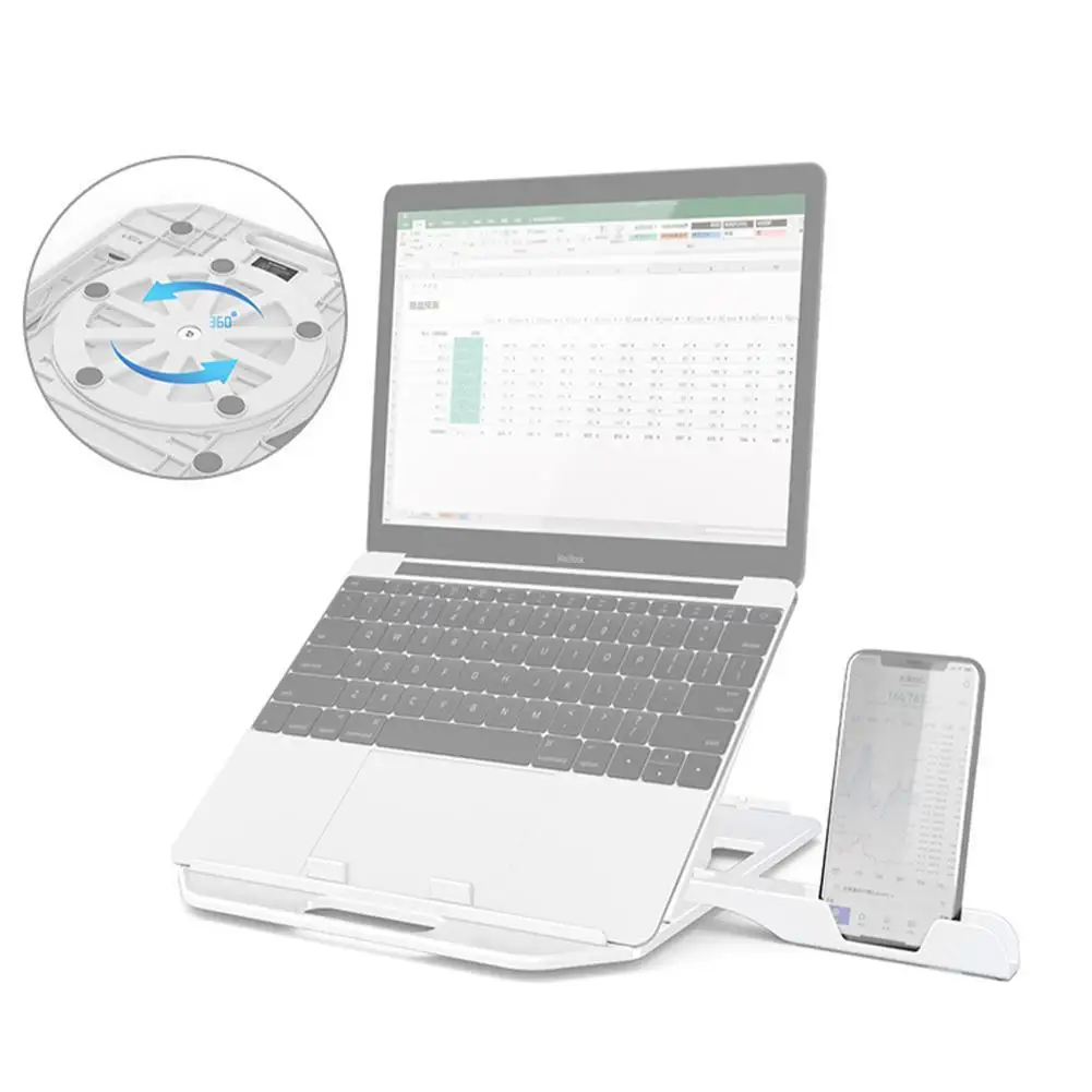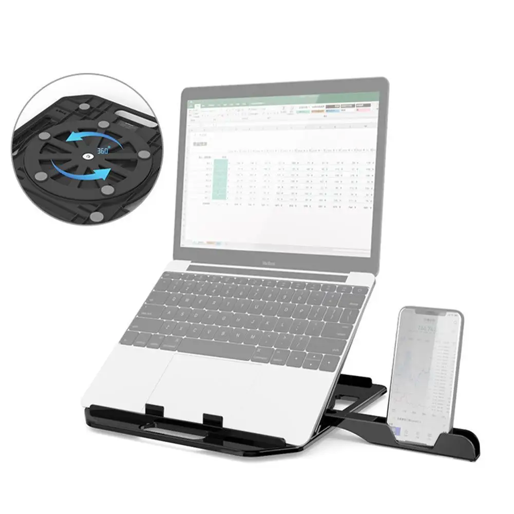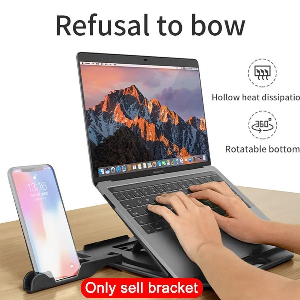 Спецификация:Цвет: черный/белыйРазмер: подходит для ноутбука и планшета 11 - 17 дюймовФункция: кронштейн для ноутбука и охлаждающая подставкаХарактеристика:1> 360 градусов вращающееся дно с держателем для телефона2>8-скорость регулировкой по высоте3> полое дно рассеивания тепла4> Нескользящая силиконовая подошваПосылка:1 * подставка для ноутбука с держателем для телефона