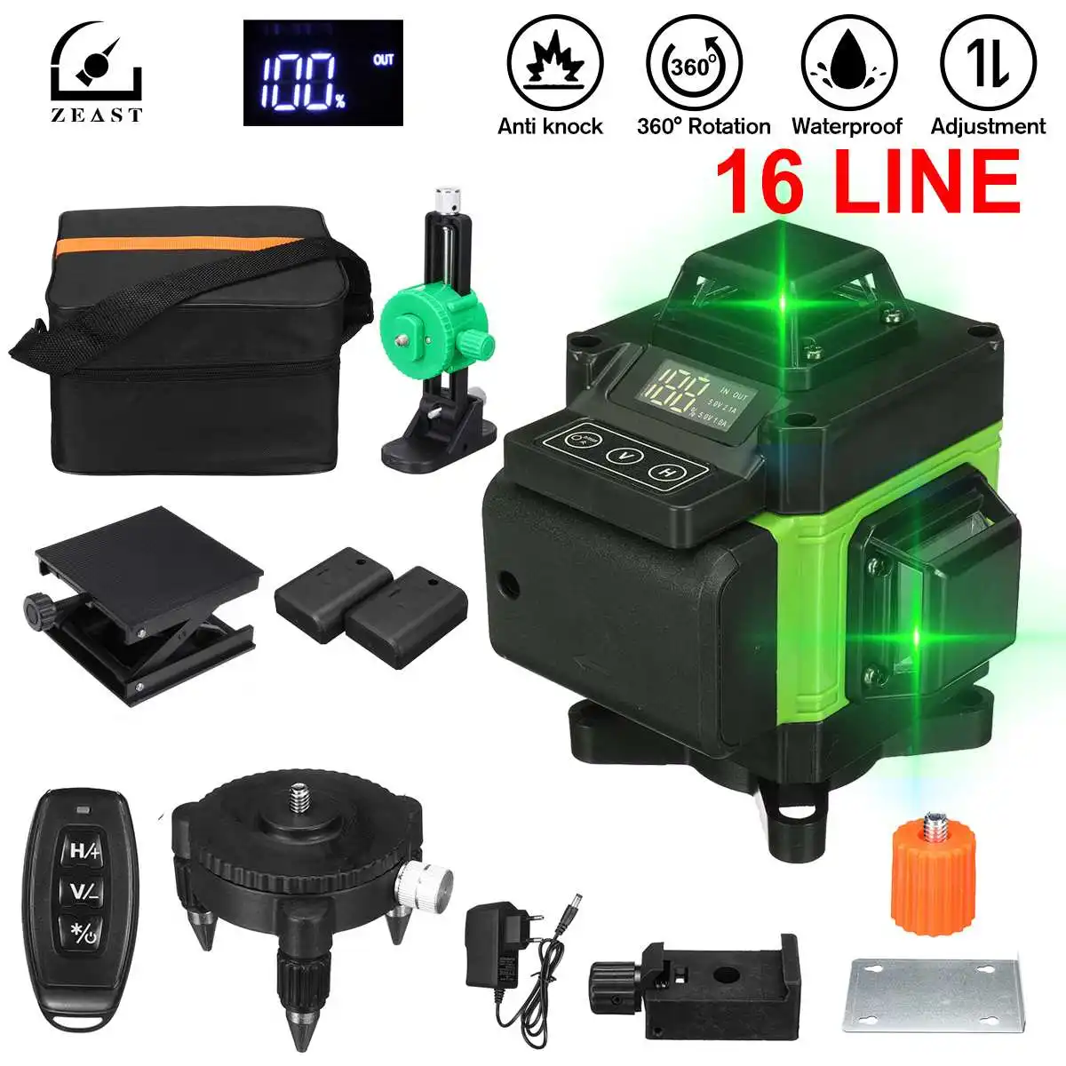 Лазерный уровень 4D, 16 линий, зеленый лазер, самонивелирующийся, Горизонтальные и вертикальные перекрестные линии на 360 градусов с 2 аккумуляторами для улицы