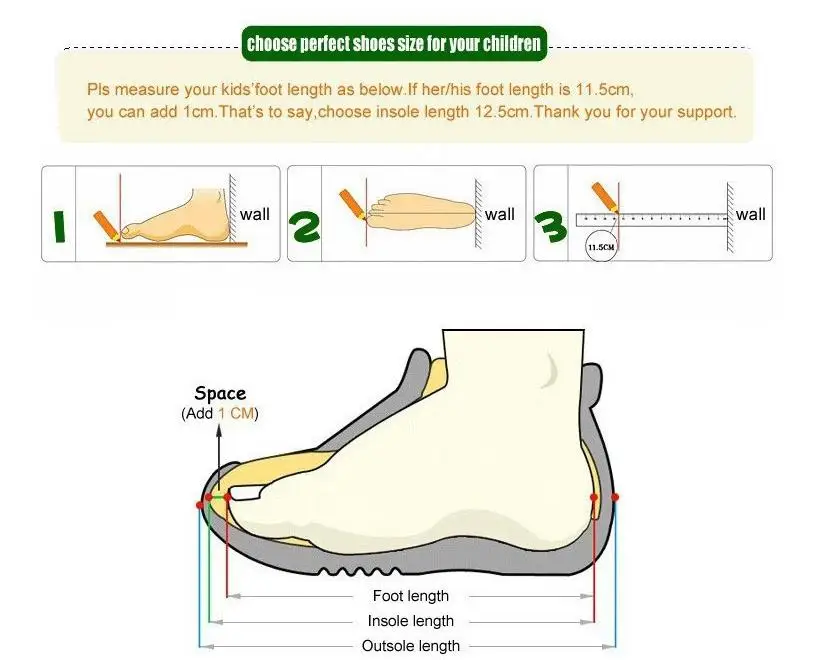 Поскольку все размеры детской обуви отличаются, при заказе детской обуви вы должны соответствовать нашим размерам и внутренней длине.