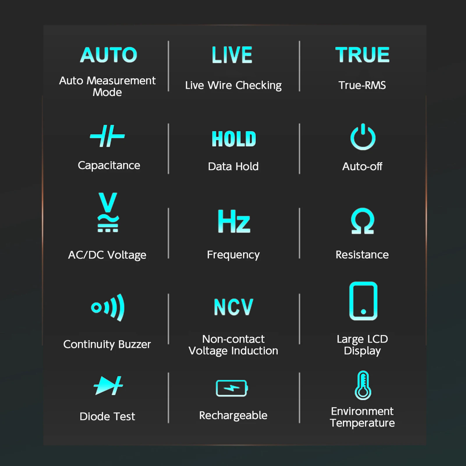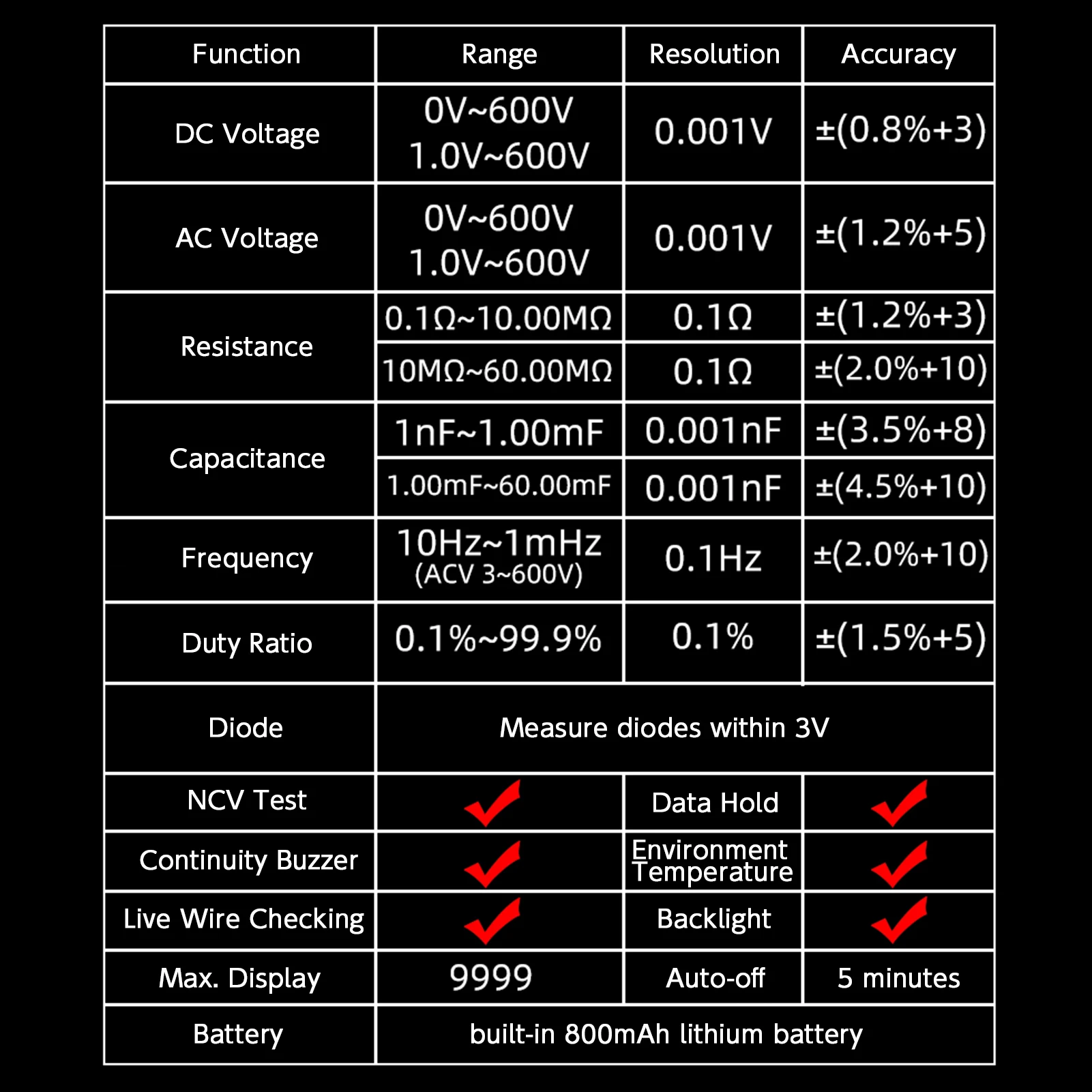 Особенности:Основные измерительные функции: включая напряжение постоянного тока, напряжение переменного тока, частоту, сопротивление, непрерывность, емкость, диод, индукцию бесконтактного напряжения, проверку провода в режиме реального времени.Автоматический режим измерения: Автоматическая идентификация напряжения переменного тока, напряжения постоянного тока, сопротивления.Широкий диапазон измерения: 0 ~ 600 В AC/DC напряжение, сопротивление 0.1Ω ~ 60MΩ, емкость 1nF ~ 60mF, частота 10 Гц ~ 10 МГц, коэффициент нагрузки 0,1 ~ 99.9%, 0 ~ 50 ℃ температуры и измерения диодов в пределах 3 В.Легко читаемый цветной ЖК-экран: значительно улучшает чтение.3 результатов: показывает напряжение, частоту и аналоговый бар на большом ЖК-дисплее одновременно.Перезаряжаемая литий-ионная батарея: встроенный литий-ионный аккумулятор емкостью 800 мА · ч, удобно заряжается входящим в комплект зарядным кабелем через компьютер или разъем USB.Безопасная Работа: полный диапазон измерения защита от перегрузки, двойная защита от изоляции, соответствует безопасной категории CAT II.Компактный размер кармана: удобный для использования одной рукой, портативный для переноски, с мешком на молнии для хранения и защиты счетчика.Характеристики:Напряжение постоянного тока: 0 ~ 600 В (Режим постоянного тока), 1 ~ 600 В (автоматический режим)Напряжение переменного тока: 0 ~ 600 В (режим переменного тока), 1 ~ 600 В (автоматический режим)Сопротивление: 0.1Ω ~ 10MΩ, 10 ~ 60MΩЕмкость: 1nF ~ 1mF, 1mF ~ 60mFЧастота: 10 Гц ~ 10 МГц (ACV 3 ~ 600 В)Коэффициент заполнения: 0,1 ~ 99.9%Материал: АБС-пластикДиапазон: Автоматический диапазонДисплей: цветной ЖК-дисплейМаксимальное значение дисплея: 9999 цифрИндикация полярности: самоиндикация, «-» означает отрицательную полярностьШирокий диапазон дисплея: "OL" или "-OL"Срок производства образца может иметь разный метраж, согласно данным о 0,4 секундАвтоматическое выключение: 5 минутИндикация низкого напряжения батареи: ЖК-дисплей символ батареиРабочая температура и влажность: 0 ~ 40 ℃, 0 ~ 80% RHТемпература хранения и влажность: -10 ~ 60 ℃, 0 ~ 70% RHРабочая высота: ≤ 2000 мАккумулятор: литий-ионный аккумулятор внутриРазмер изделия: 113,3*54,2*22 мм/4,46*2,13 * 0.87inВес изделия: 102 г/3,60 унцийВес посылка: 250 г/8,52 унцийПосылка Размеры: 18*8,5*4 см/7,09*3,35 * 1.57inУпаковочный лист:1 * мультиметр1 * пара тестового свинца1 * зарядный кабель1 * чехол для хранения1 * Руководство (на английском языке)