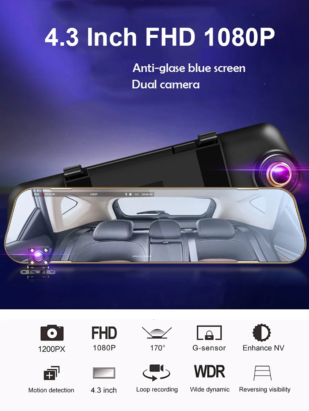 Видеорегистратор на зеркало заднего вида, 4,3 дюйма, 1080P, Full HD