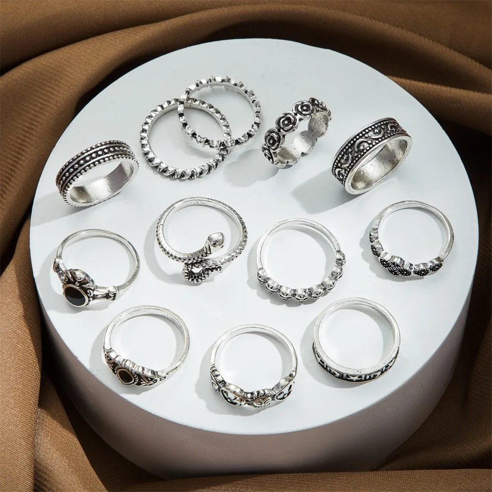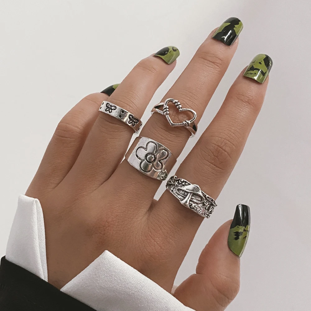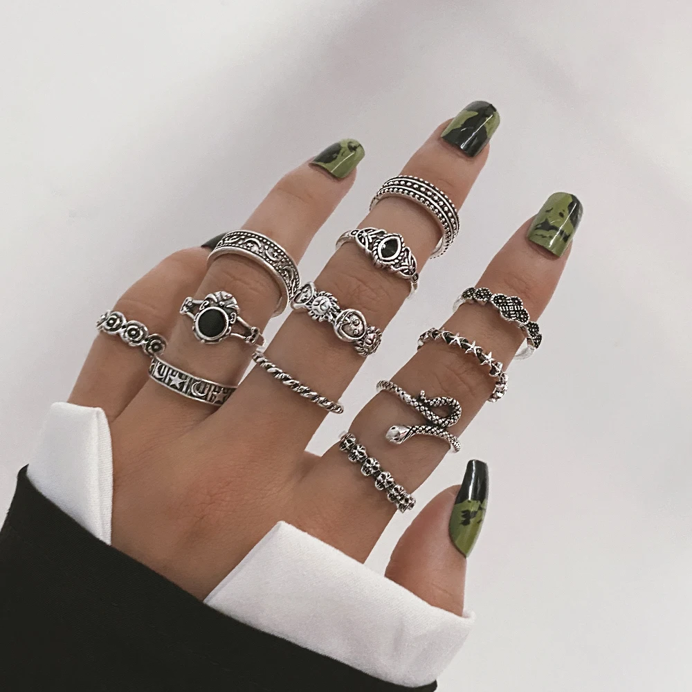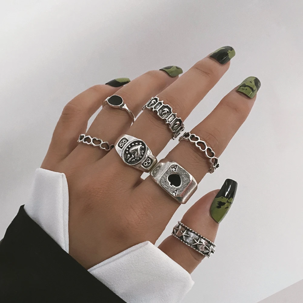Набор колец с сердечком в стиле панк в готическом стиле для женщин, черные кости, винтажные пики, туз, посеребренные, ретро, со стразами, очарование, бильярдные украшения для пальцев