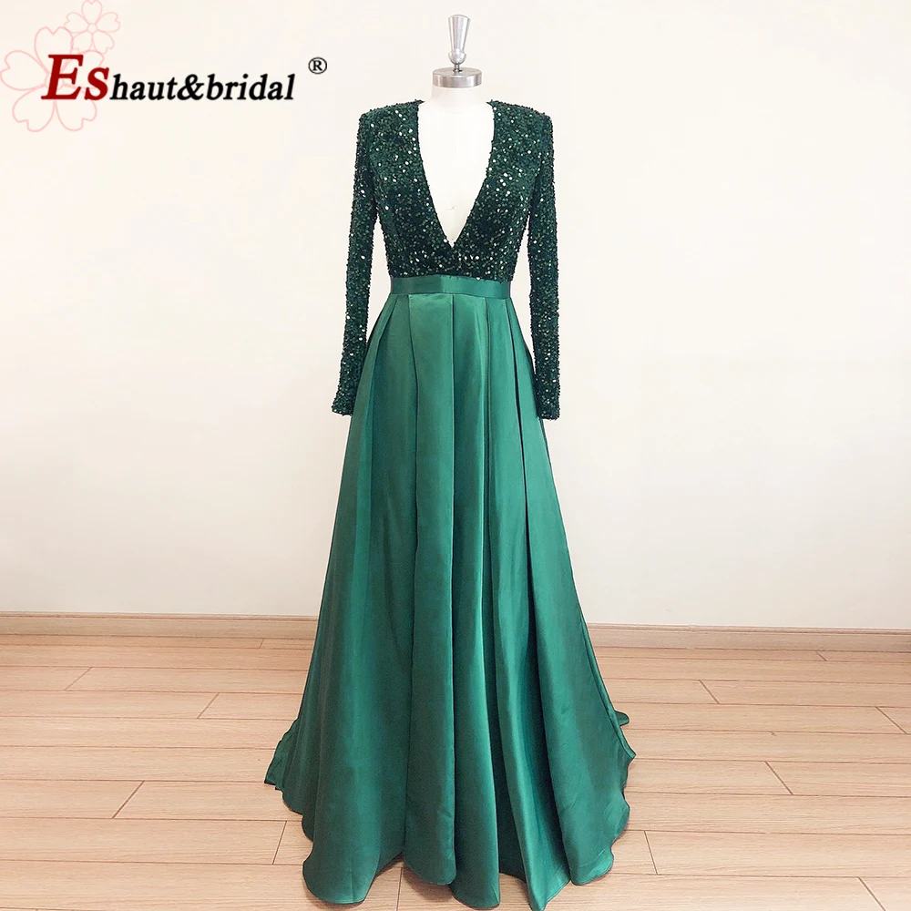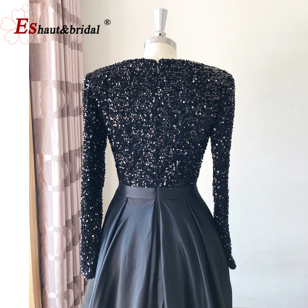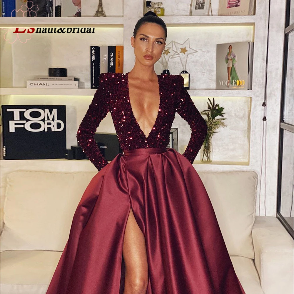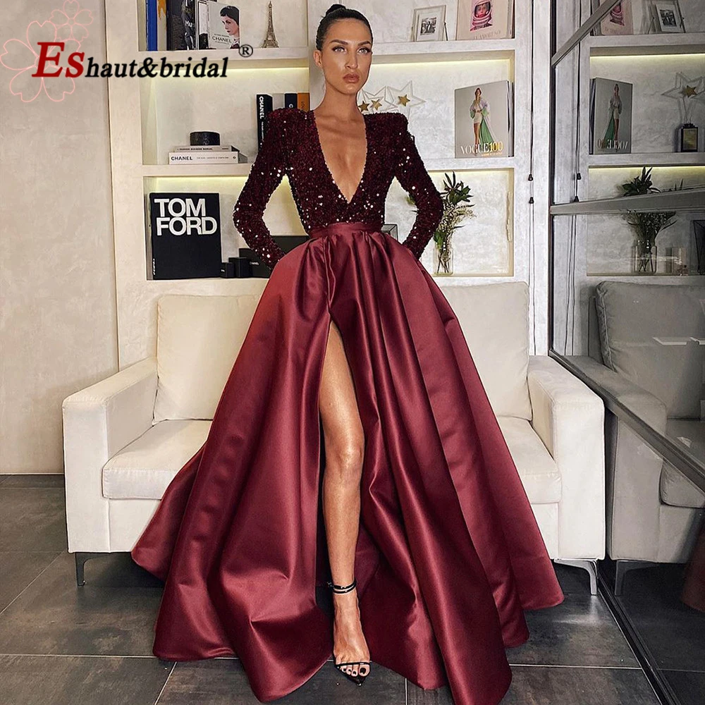 Женские вечерние платья с высоким разрезом, роскошные блестящие вечерние платья с V-образным вырезом и длинными рукавами, бальные платья для выпускного вечера и свадьбы, 2021
