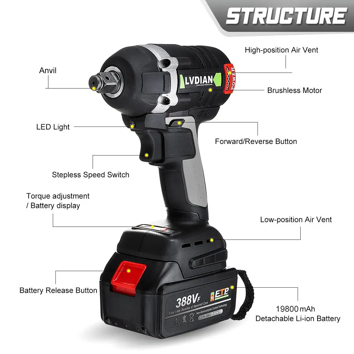 Название: Бесщеточный беспроводной электрический ключ 388VFЦвет: черный + желтый, черный + серыйРазмер: 11 × 7 × 25 см (4,3 × 2,8 × 9,8 дюйма)Вход: 110-240 В переменного тока, 50 ГцТип батареи:388VFЕмкость аккумулятора:15000 мАчМаксимальный крутящий момент:520н. МСкорость холостого хода: 0-3000 об/минЧастота удара: 0-3600 об/минОсобенности-Беспроводной электрический гайковерт с питанием от литий-ионной перезаряжаемой батареи.-Мощный бесщеточный двигатель с крутящим моментом до 630 нм для эффективного удара.-Триггер переменной скорости для отличной стабильности и контроля.-Переключатель 3 в 1 для движения вперед/блокировки/обратного хода.-Встроенный светодиодный Светильник Освещает темные рабочие места.-Аккумулятор большой емкости для длительной работы.-Нескользящий мягкий захват позволяет легко и удобно держать.Посылка1 х бесщеточный ударный ключ1 литий-ионный аккумулятор1 блок питания переменного тока(Распределите адаптер в соответствии с вашей страной.)Примечание:1. Возможны отклонения в 1-5 мм из-за ручного измерения. Перед размещением заказа, пожалуйста, внимательно ознакомитесь со всеми условиями.2. Цвета на дисплеях могут отличаться, надеемся на понимание.