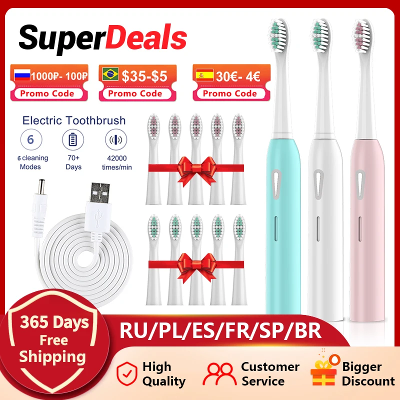 Зубная щетка звуковая электрическая, 6 режимов, с таймером