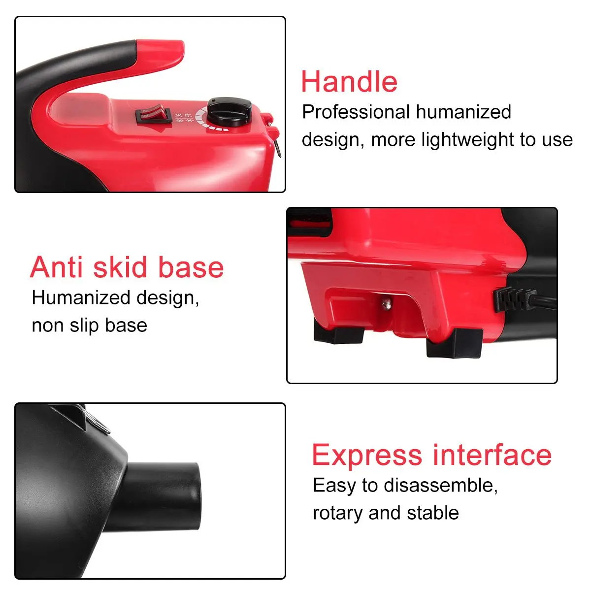 Технические характеристики Цвет: синий/красный/черныйМатериал: пластикМощность: 3000 ВтНапряжение: 100-220 ВЧастота: 50 ГцШум: ≤ 65 дБСкорость ветра: 38 м/сТемпература: ≤ 65 ℃Длина шланга: 2 метраВилка: штепсельная вилка европейского стандарта