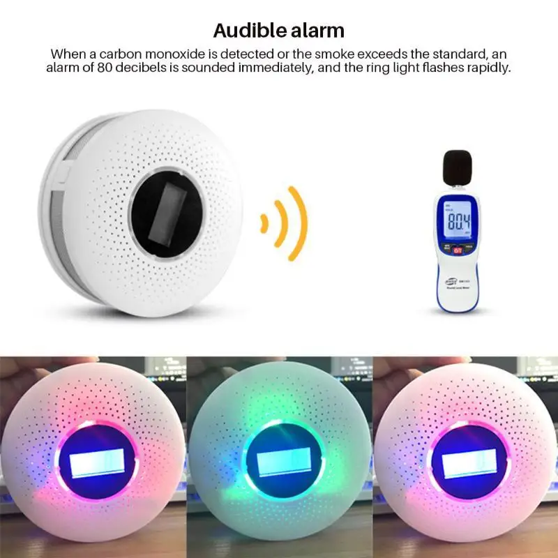 ● При обнаружении окиси углерода или превышении уровня дыма, сразу же срабатывает сигнал тревоги 80 децибел, и кольцевой светильник быстро мигает.