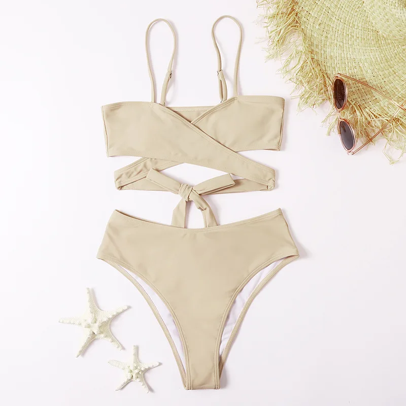 Купальник COOBBU с высокой талией, женский сексуальный бикини с пуш-ап, Однотонный женский купальник 2021, купальные костюмы с перекрестными лямками, Женский комплект бикини