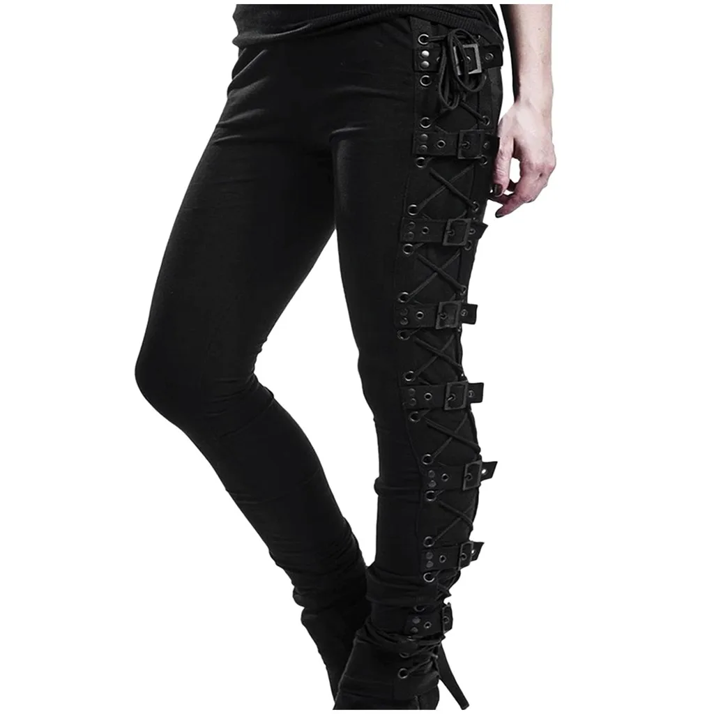 Женские Модные готические леггинсы со шнуровкой сбоку, черные обтягивающие брюки