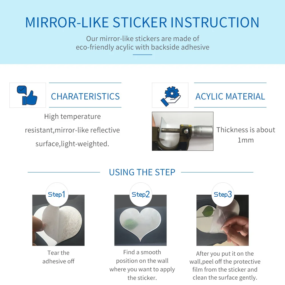 Как использовать: каждая пластиковая Зеркальная Наклейка крепится с защитной пленкой на лицевой стороне, оторвав защитную пленку, может показать отражение зеркала; отшелушивающая задняя сторона приклеивается к поверхности объекта; Обратите внимание на то, чтобы выбрать поверхность как можно более smmoth, чтобы показать хорошее зеркальное отражение