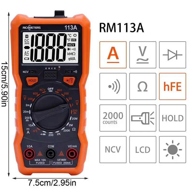 Мультиметр RICHMETERS 113A 2000 расчетов 1. Диапазон напряжения переменного тока: 200 В/600 В Разрешение: мВ/1 в 2. Диапазон постоянного тока: 200 мВ/2 в/20 в/600 в/в Разрешение мВ/1 мВ/10 мВ/1 в 3. Постоянный ток: 2 мА/20 мА/200 мА/10 А Разрешение: 1 мкА/10 мкА/100 мкА/10 мА 4. Диапазон сопротивления: 200/2K/200K/2M/20M Разрешение: 0,1/1/100/1K/10K