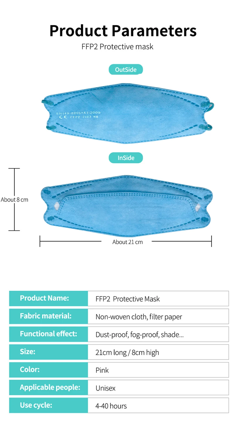 Примечание: маска напечатана "FFP2 NR EN 149:2001 + A1:2009 CE 2163" для взрослыхПреимущества масок для рыб:①Comfortable в носке.②Хороший эффект фильтрации, особенно для очень мелких частиц и пыли.③ Подходит для различных форм лица.④ Высококачественный защитный эффект. Его защитный эффект такой же, как маска KN95 и Европейская маска FFP2.Applicable применяется в различных средах, где защитные маски необходимо носить в течение длительного времени, таких как фабрики, школы, компании, торговые центры, песчаные бури, строительные площадки, больницы, парки и т. Д.