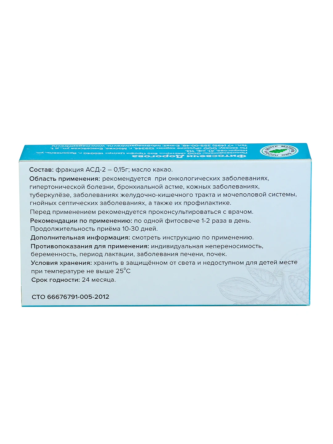 Двухкомпонентные суппозитории состоят из основы – масла какао (85%) и действующего вещества – фракции АСД-2 (15%).