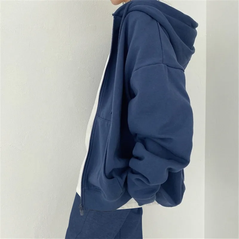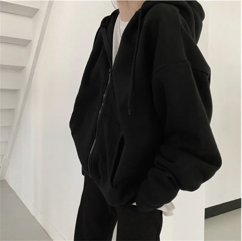 Женские толстовки с капюшоном, однотонные флисовые толстовки большого размера с карманами на молнии в Корейском стиле Харадзюку, повседневные женские пальто с длинным рукавом, Топ