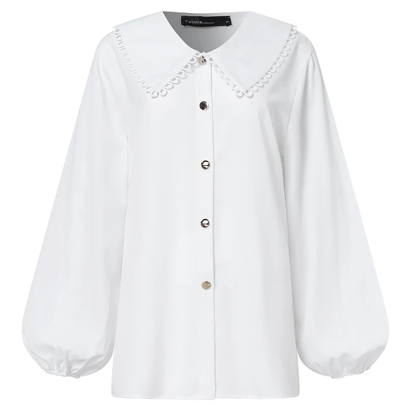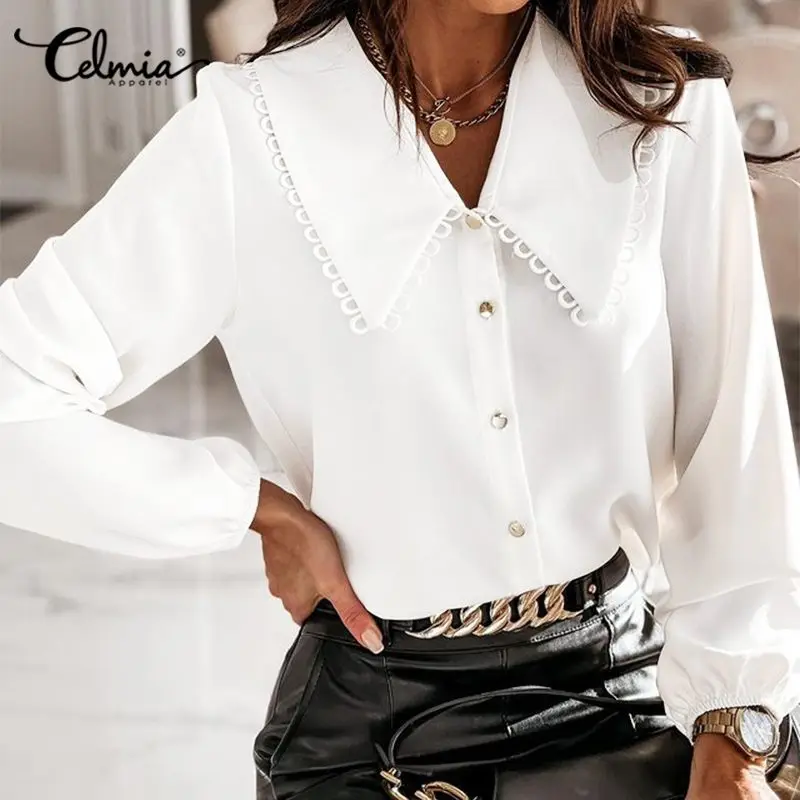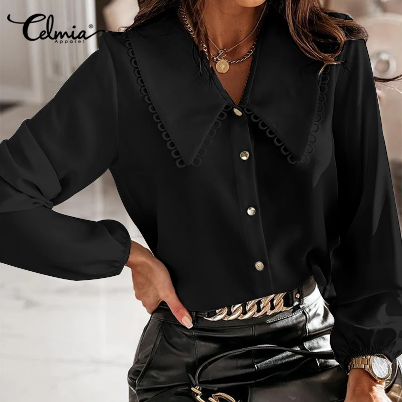 Элегантные блузки Celmia, женские рубашки с рукавами-фонариками, 2021, модные кружевные топы, повседневные свободные блузки для вечеринки и работы, рубашка-туника на пуговицах