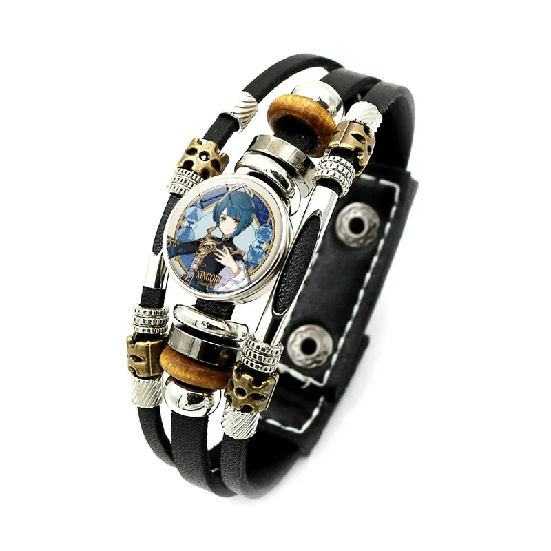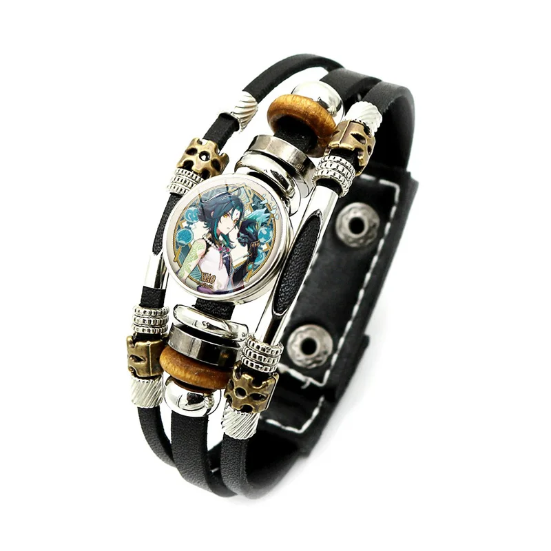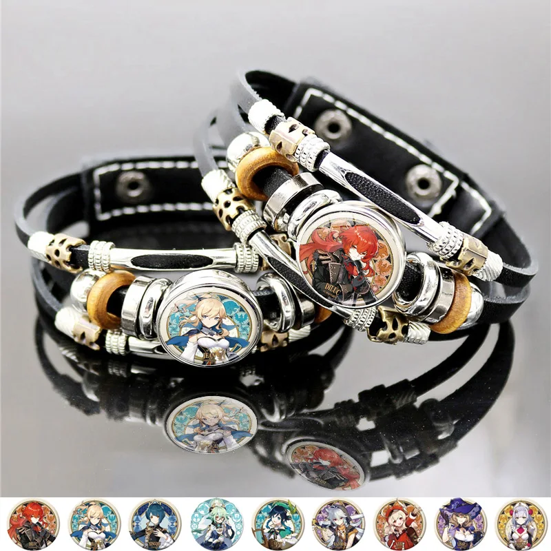 Амулетный браслет Game Genshin Impact для мужчин, Мультяшные аниме ювелирные изделия, косплей, стеклянные кнопки, многослойный Плетеный Кожаный Браслет в стиле панк