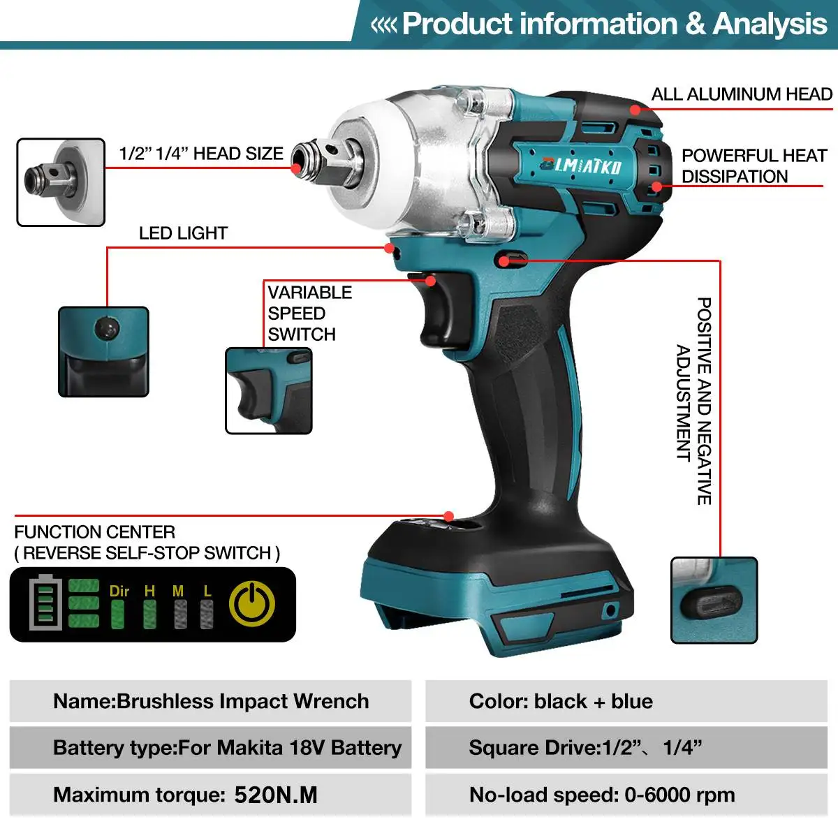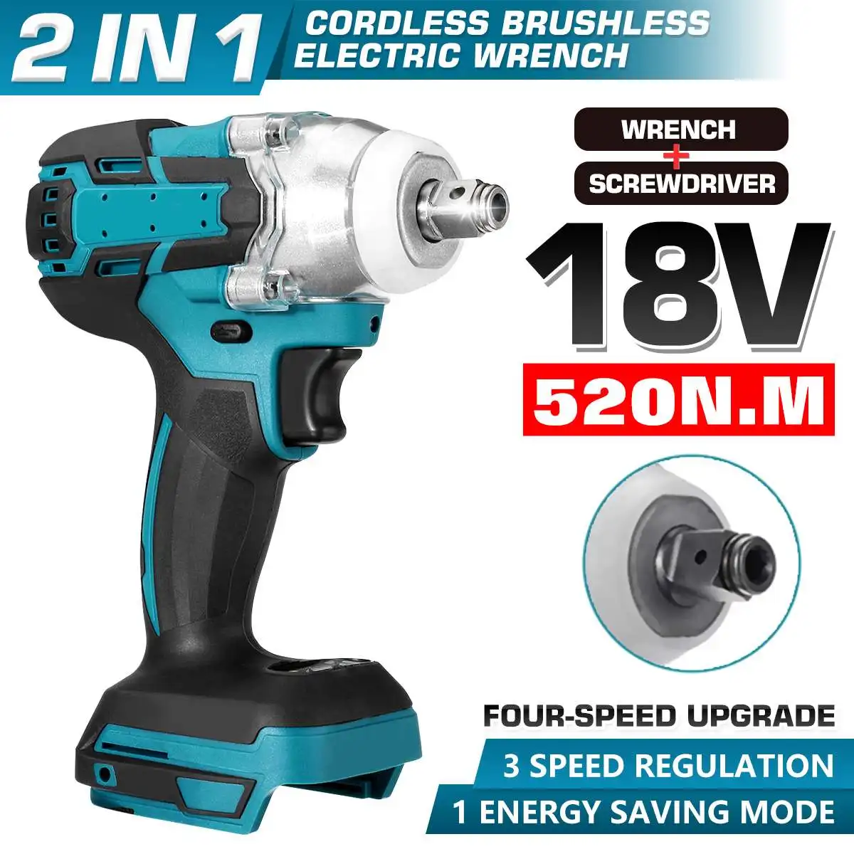 520нм бесщеточный ударный ключ беспроводной 1/2 розетка электрический ключ Электроинструмент (не включая батарею)