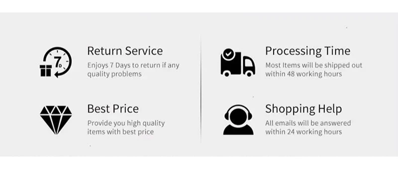 Мы обещаем решить проблему на 100%. Если продукт, который вы получили, имеет проблемы с качеством или поврежден в процессе логистики, или вы не получили посылка, или даже если вам не нравится продукт, который вы выбрали после получения посылка, пожалуйста, свяжитесь с нами вовремя. Возврат средств и замена продукции разрешены.