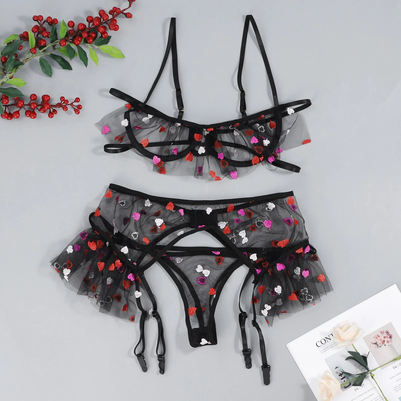 Бюстгальтер с вышивкой Love, стринги, нижнее Белье для сна, женское нижнее белье, подвязка