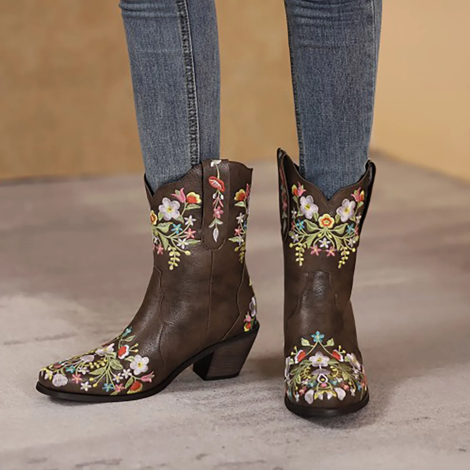 Женские ботинки короткие ботинки на толстом каблуке средней высоты с вышивкой в стиле ретро женские ботинки