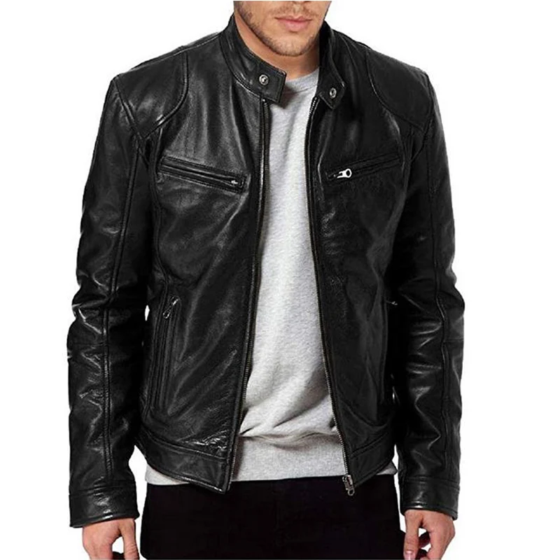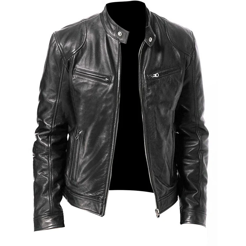 Мужская приталенная куртка из натуральной кожи, теплая мотоциклетная куртка с воротником-стойкой, на молнии, в стиле смарт-кэжуал