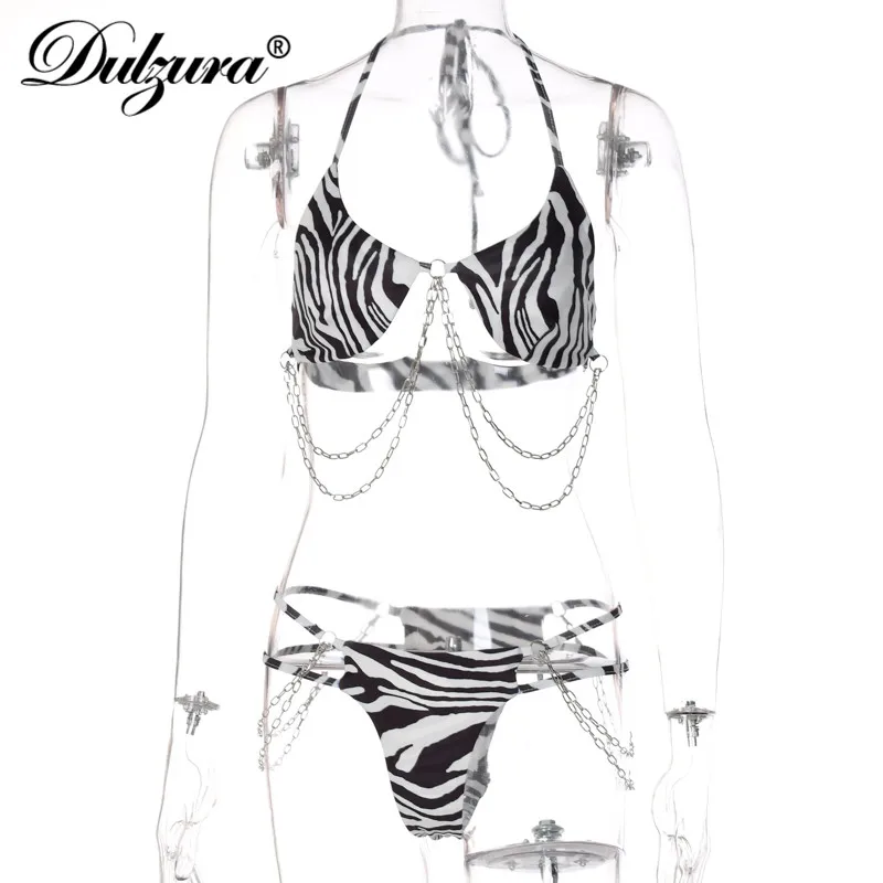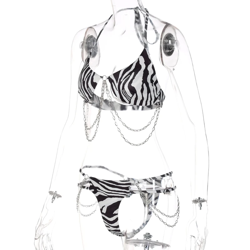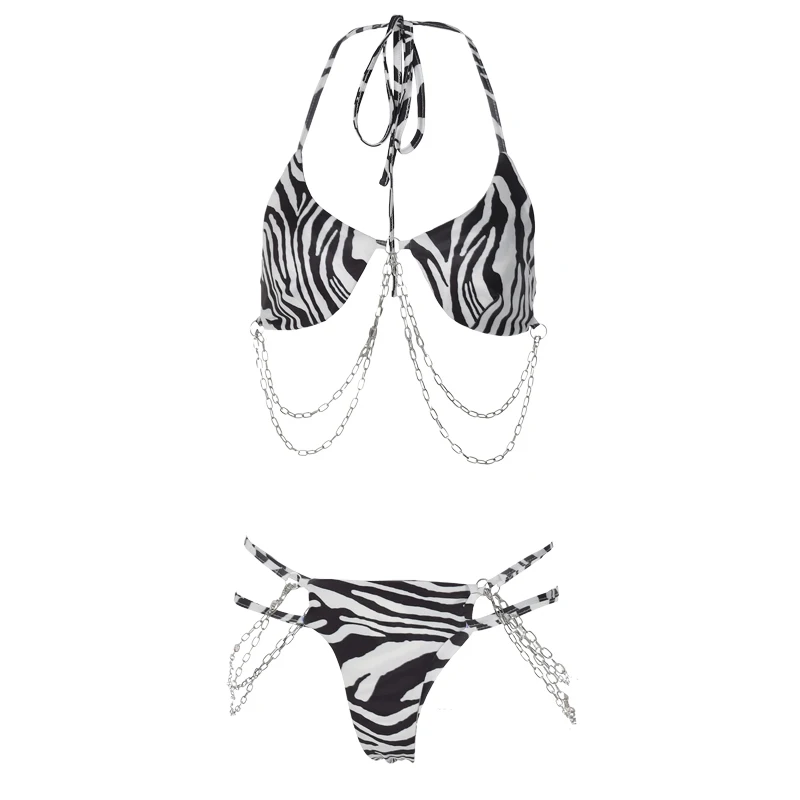 Женский купальный костюм из 2 предметов, с принтом зебры и лямкой на шее цепь бикини, комплекты со стрингами, для клуба, на осень и зиму, 2021