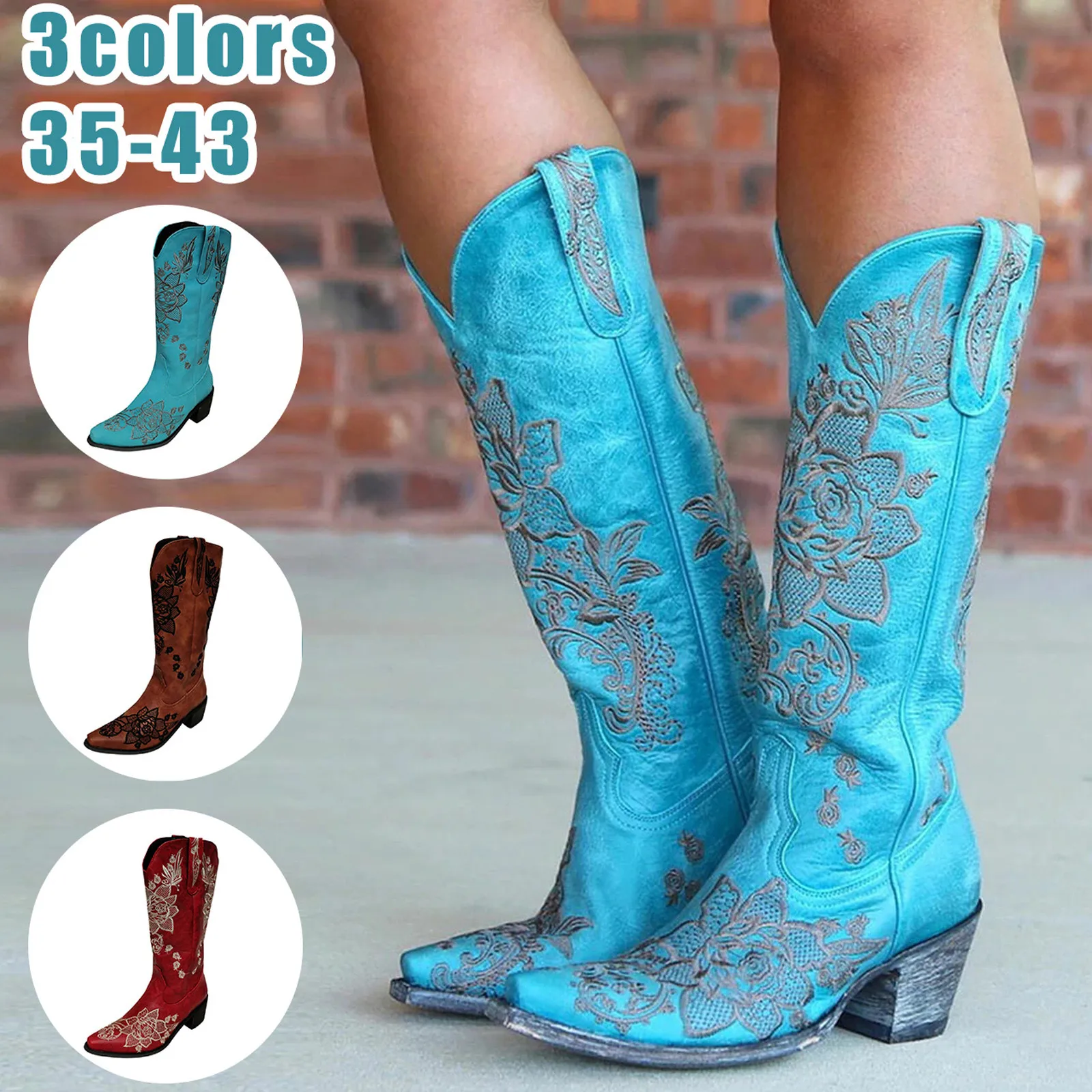 Женские модные сапоги с вышивкой, разноцветная женская обувь до колена, ретро сапоги на среднем каблуке, женские ковбойские сапоги #4
