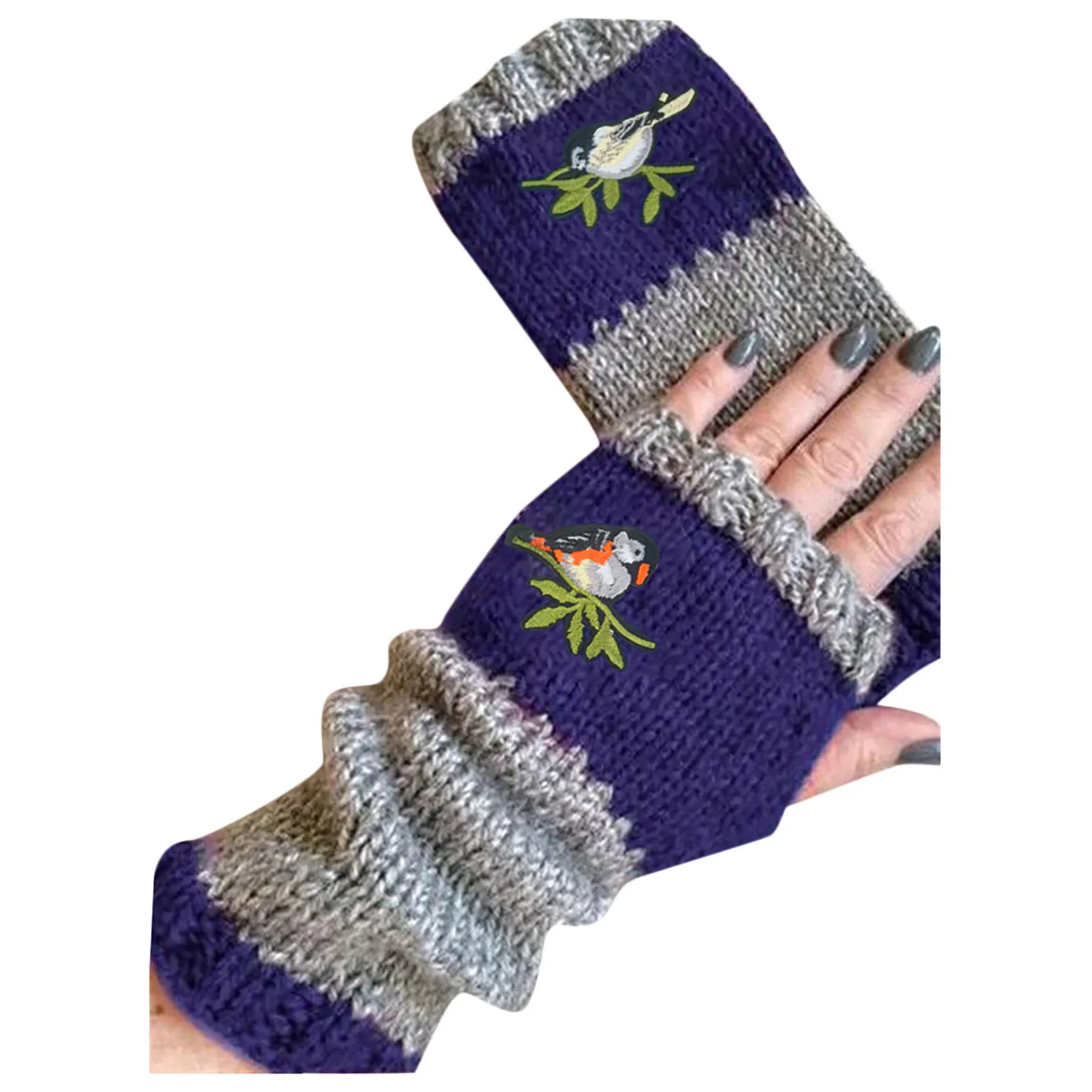 Перчатки с вышивкой в виде птиц, хлопковые перчатки без пальцев для женщин, вязаные комбинированные варежки, женские перчатки без пальцев для девочек