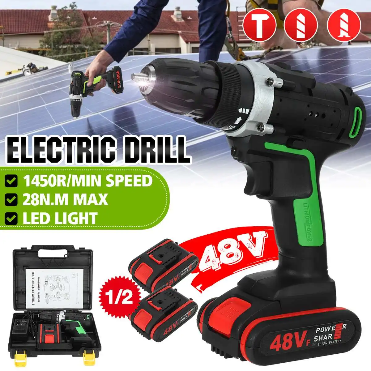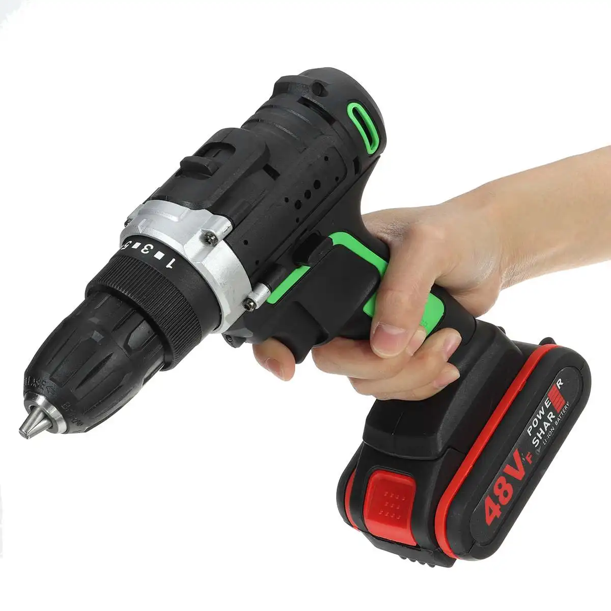 Технические характеристикиНаименование: электрическая дрельНапряжение батареи: 48 ВМаксимальный крутящий момент: 25-28 нмБез скорости нагрузки: 0-450р/мин, 0-1450р/минЗарядное устройство:Вход: 110-240 в 50-60 ГцВыход: 1.3A