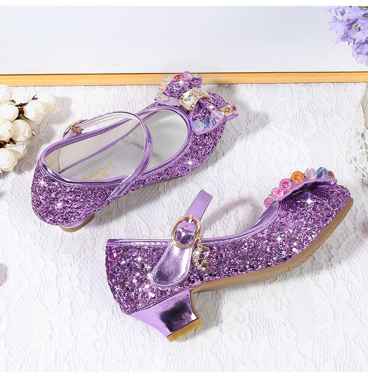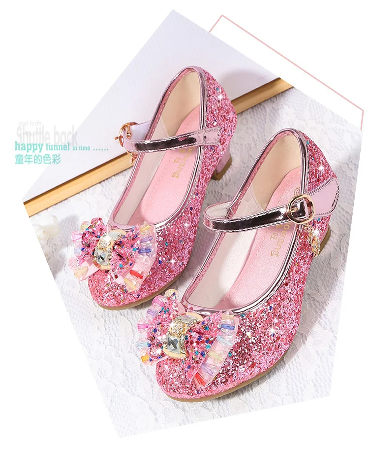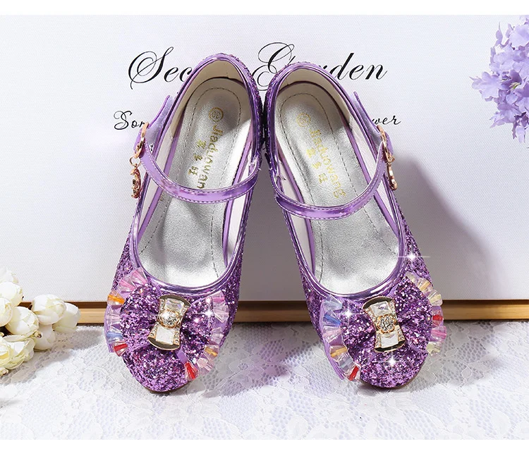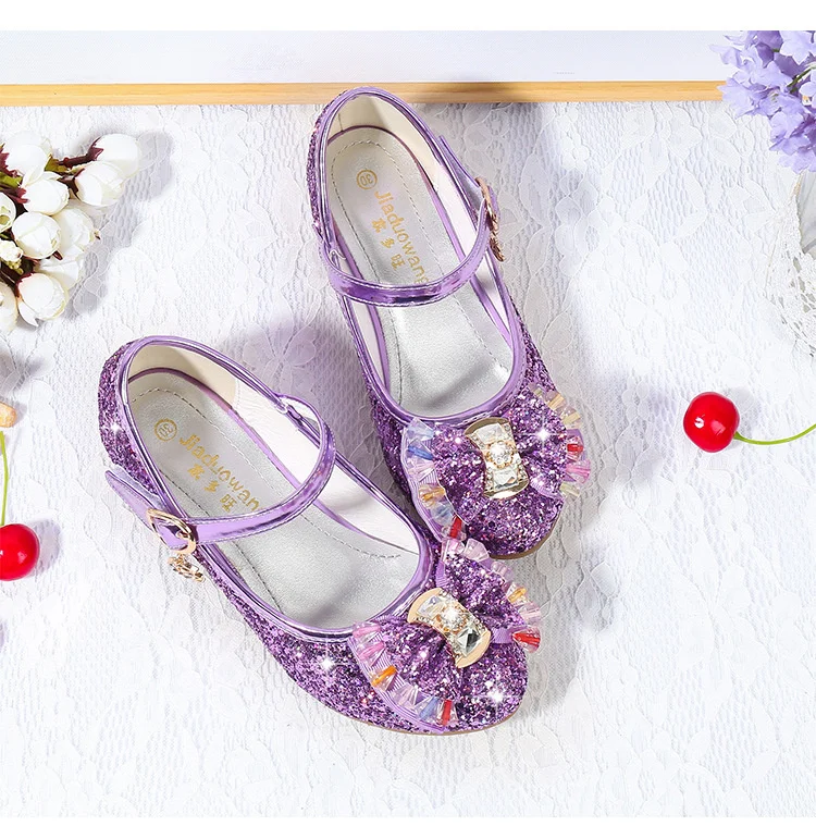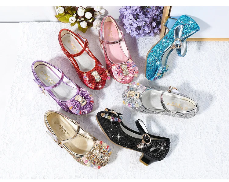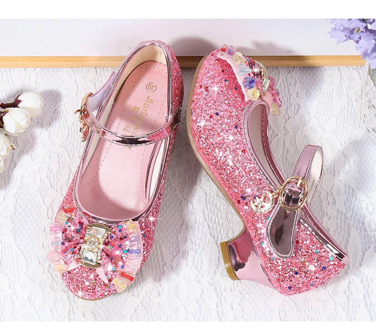 Детские кожаные туфли принцессы для девочек, повседневные блестящие туфли с цветами, на высоком каблуке, с бантом-бабочкой, синие, розовые, серебристые