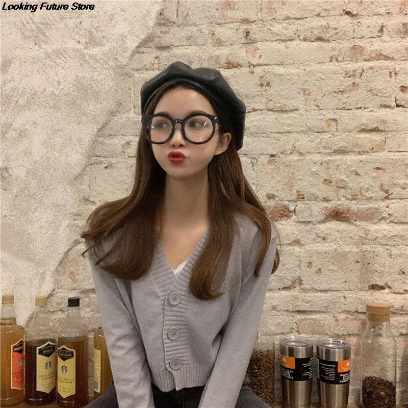 Укороченный вязаный кардиган, женский короткий свитер в Корейском стиле, Кардиган с длинным рукавом и V-образным вырезом, зеленая Женская одежда с расклешенной талией