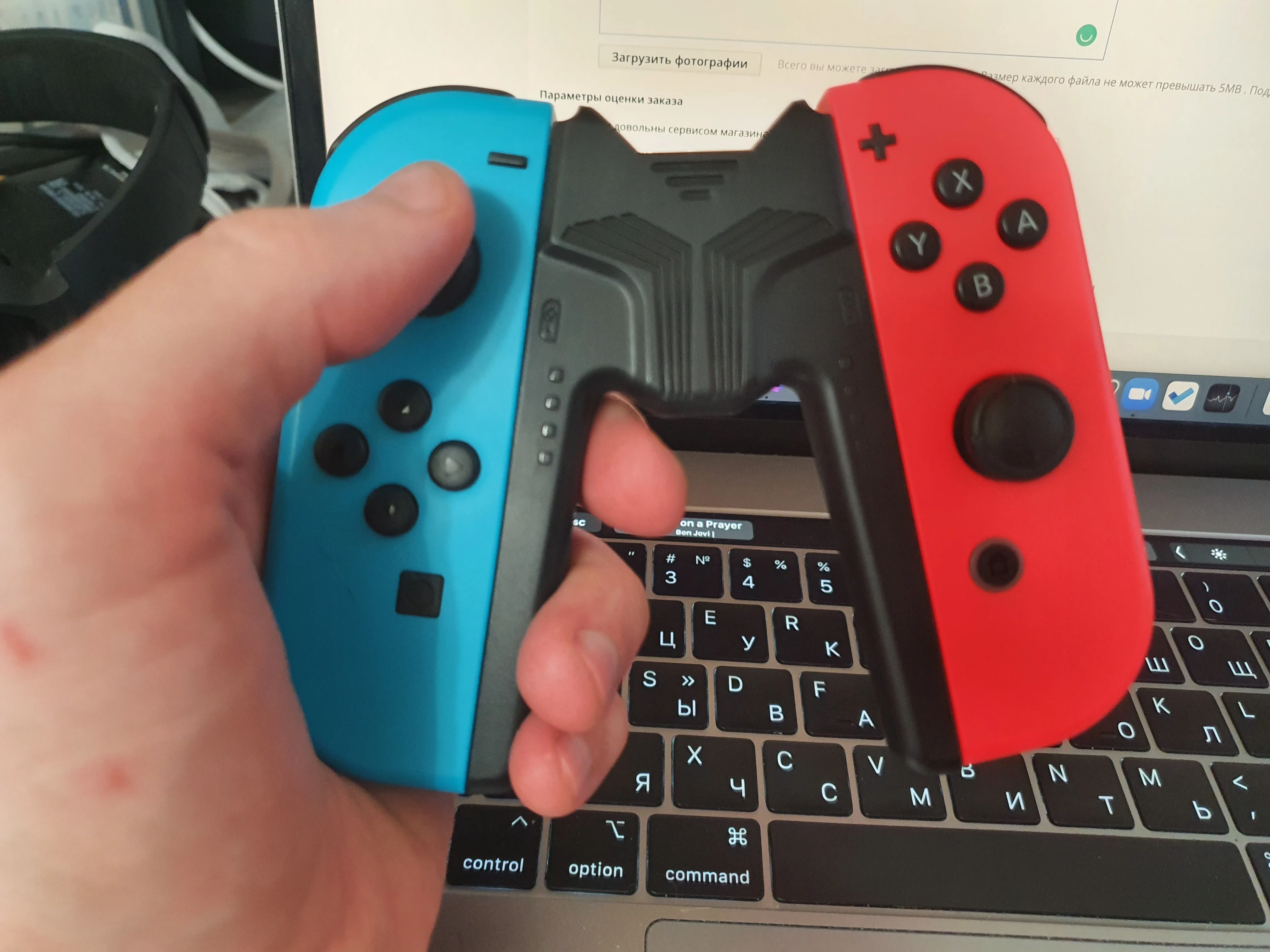 Коробка пришла помятая, но содержимое не пострадало. А комплекте: сам держатель, шнур USB Type-C длиной 3 метра, инструкция на английском и китайском. Маленький, компактный держатель. Таскать с собой удобнее, чем родной. Заряжает хорошо, наушники включаются автоматически, если держатель подключен шнуром к консоли через док. При этих условиях не очень понятно, насколько нужна возможность подключения наушников - кажется, проще взять наушники с длинным шнуром и подключить к монитору или телевизору. Держать довольно удобно, но доступ к крестовине левого джойкона немного сложнее, чем на стандартном держателе. Значки сверху светятся красным при зарядке и зелёным, если джойкон полностью заряжен.