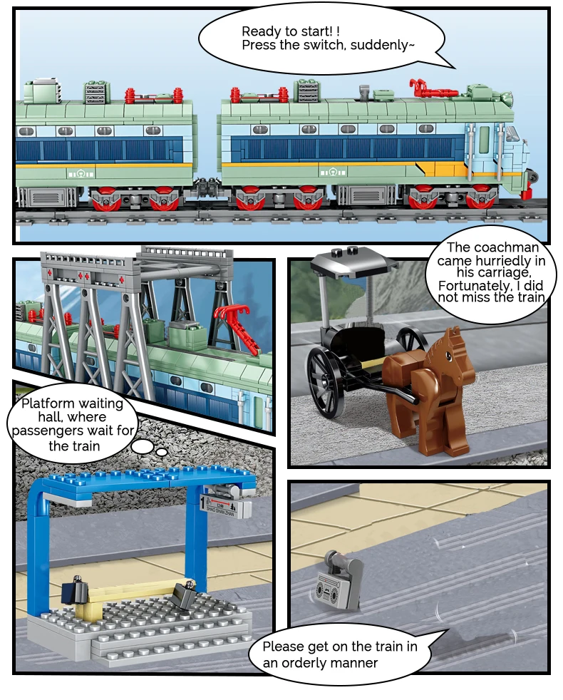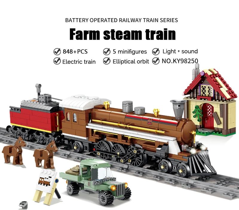 Подходит к жд. дороге Лего идеально. Пульта управления не было. Собирать геморой, все пакетики можно было открывать сразу и собирать.