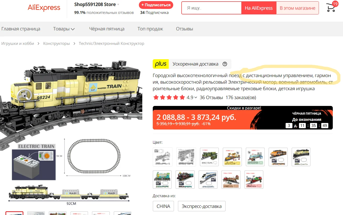 поезд пришёл до Уфы за 9 дней. купил сыну на НГ , буду надеяться что все детали приехали в пакете. Очень много маленьких пакетиков, пронумерованы от 1 до 4 ,причём пронумерованных но разных примерно в количестве 20 штук (военный поезд). цифра 1-а пакетиков 5 с этой цифрой,но разными деталями и т.д. И инструкция не особо понятна,какой пакетик нужно вначале вскрывать. Всё пришло целое, т.е. не сломаны детали.