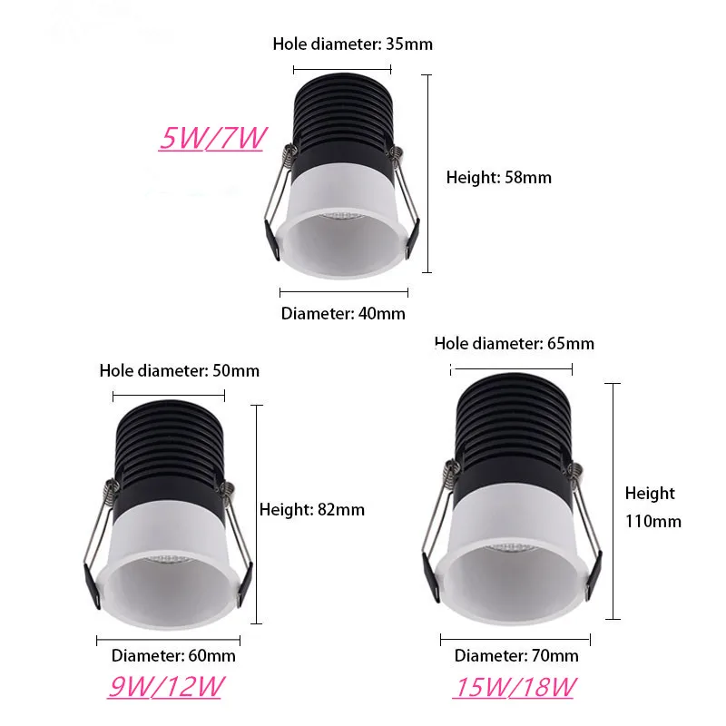 Product Name: Classic Round COB LED Recessed DownlightMaterial: Die casting AluminumLed Source: COB Chip(CREE)Power: 5w 7W 9WInput(AC): 86-265V 50/60HzColor Rendering Index(CRI): RA>92Lamp body Color: WhiteLuminous Flux: 130LM/WColor temperature: Warm White(3000-3500K), Natural White(4000-4500K),White(6000-6500K).Working temperature: -25℃-+60℃Dimension:as pictureBeam Angle: 45-60 degreePower Factor(PF):>0.95Lifespan: 80000 hoursWarranty: 5 years