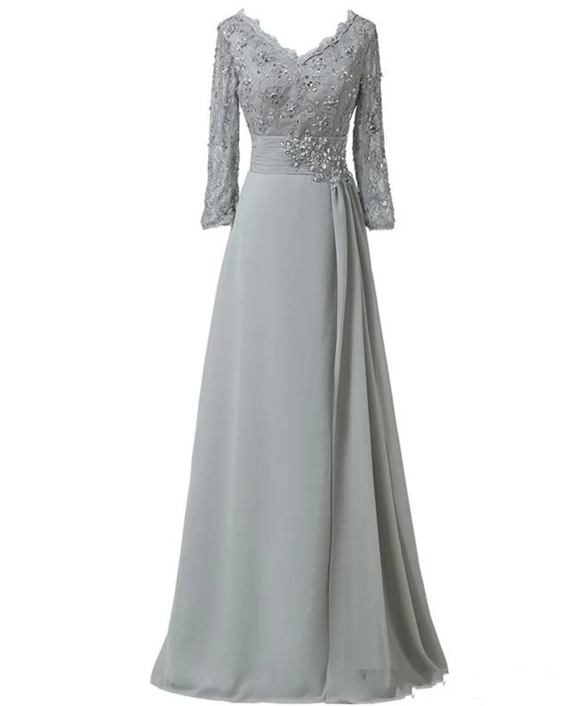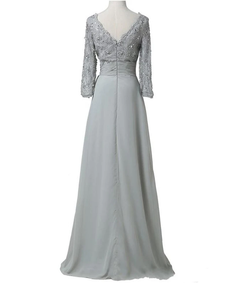 Модные плиссированные серые кружевные платья для матери невесты с V-образным вырезом и длинным рукавом