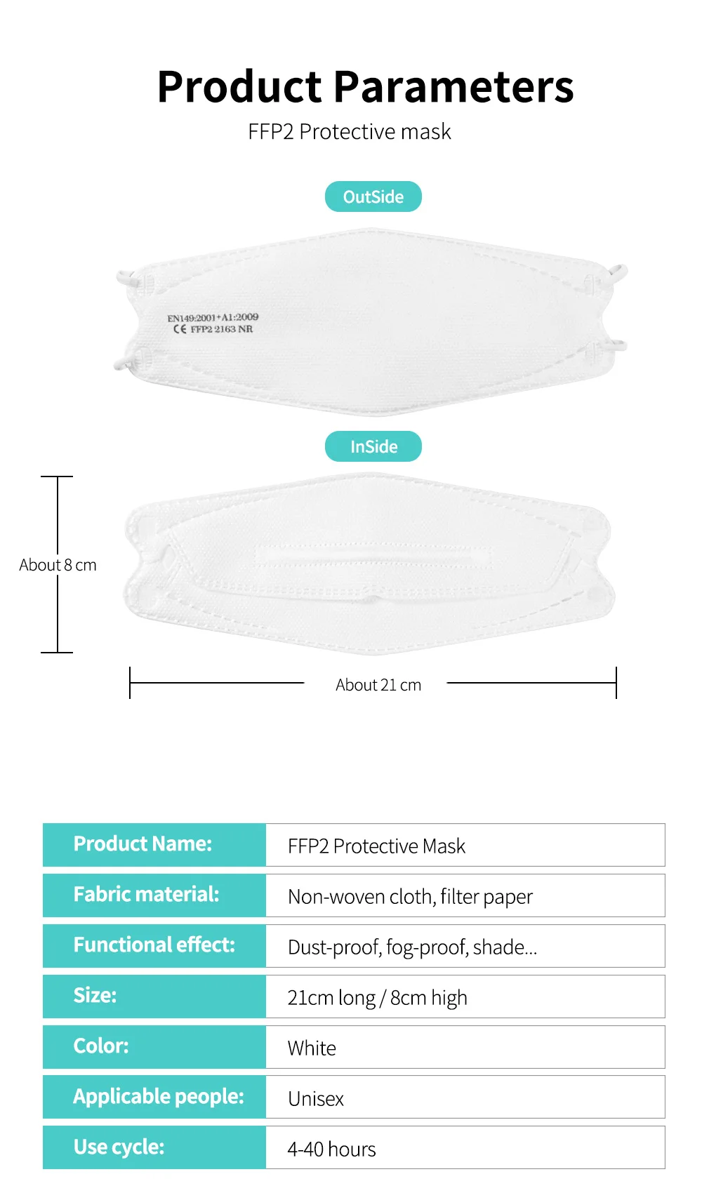 Примечание: маска напечатана"FFP2 NR EN 149:2001 + A1:2009 CE 2163"ДляВзрослый