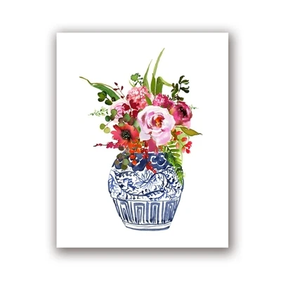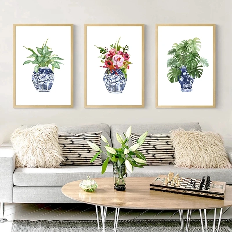 Китайский цветочный горшок с художественной печатью, сине-белый фарфор, китайская ваза мин, Настенная картина на холсте, постер, Цветочный декор для гостиной