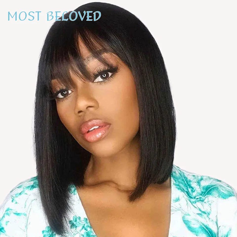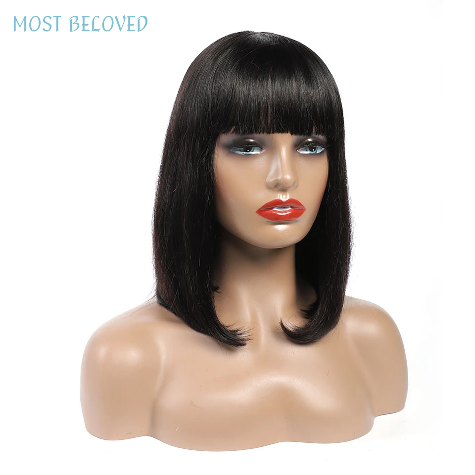 Прямой парик Боб с челкой, парики из человеческих волос машинной ра...
