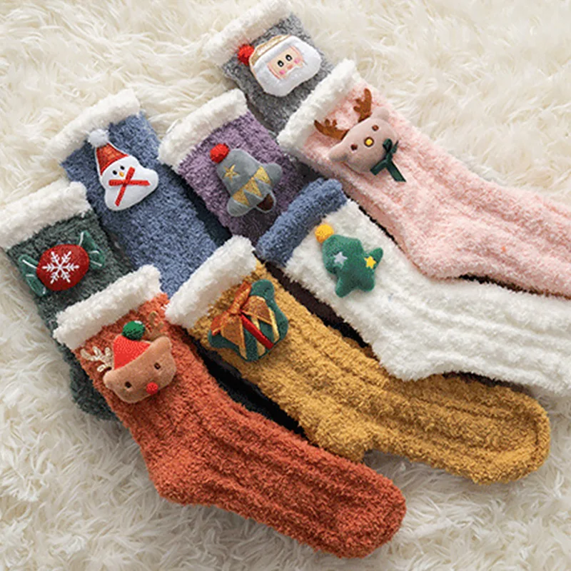 Рождественские носки, зимние носки с вышивкой, домашние носки из кораллового флиса, Мультяшные японские милые женские носки средней длины с камином, женский подарок
