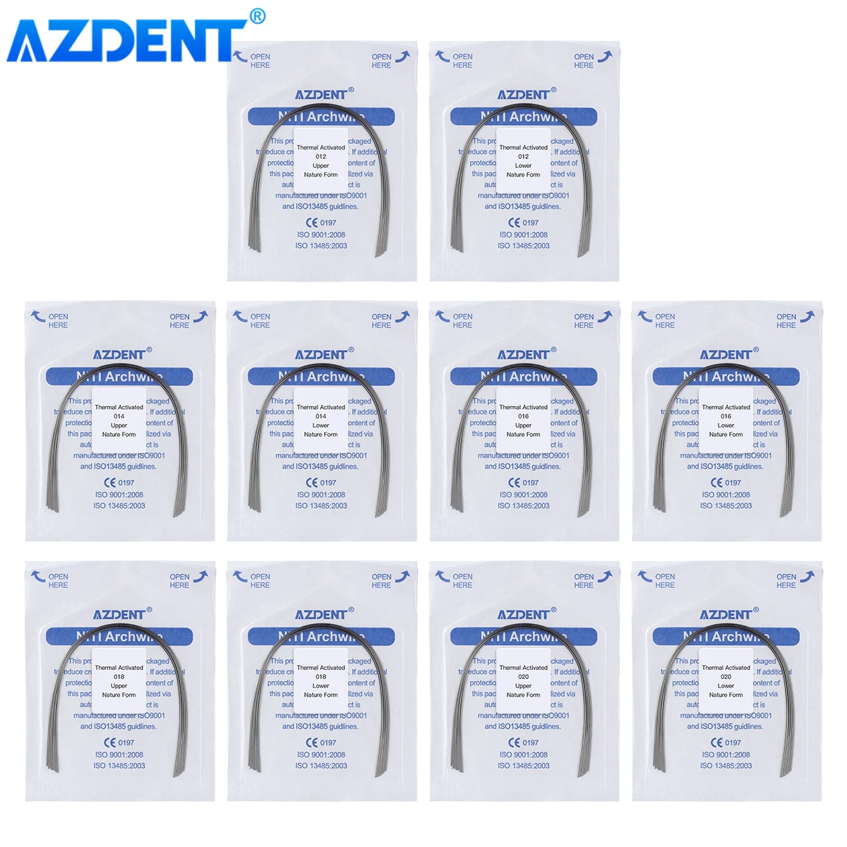 10 упаковок стоматологических ортодонтических сводов AZDENT, провода тепловой активации, Niti, круглые своды, натуральная форма, верхняя, нижняя, 10 цветов