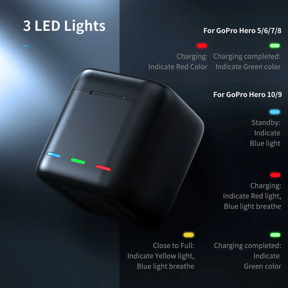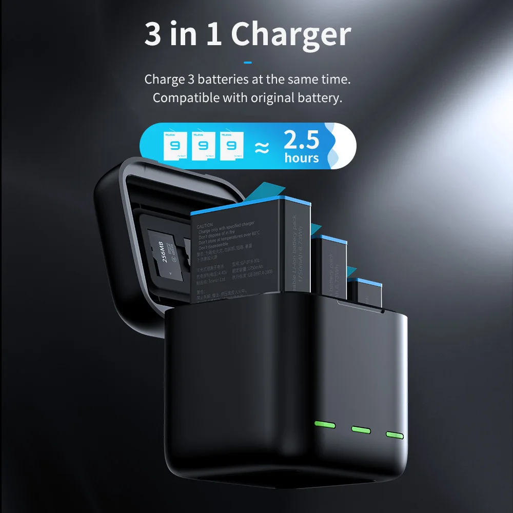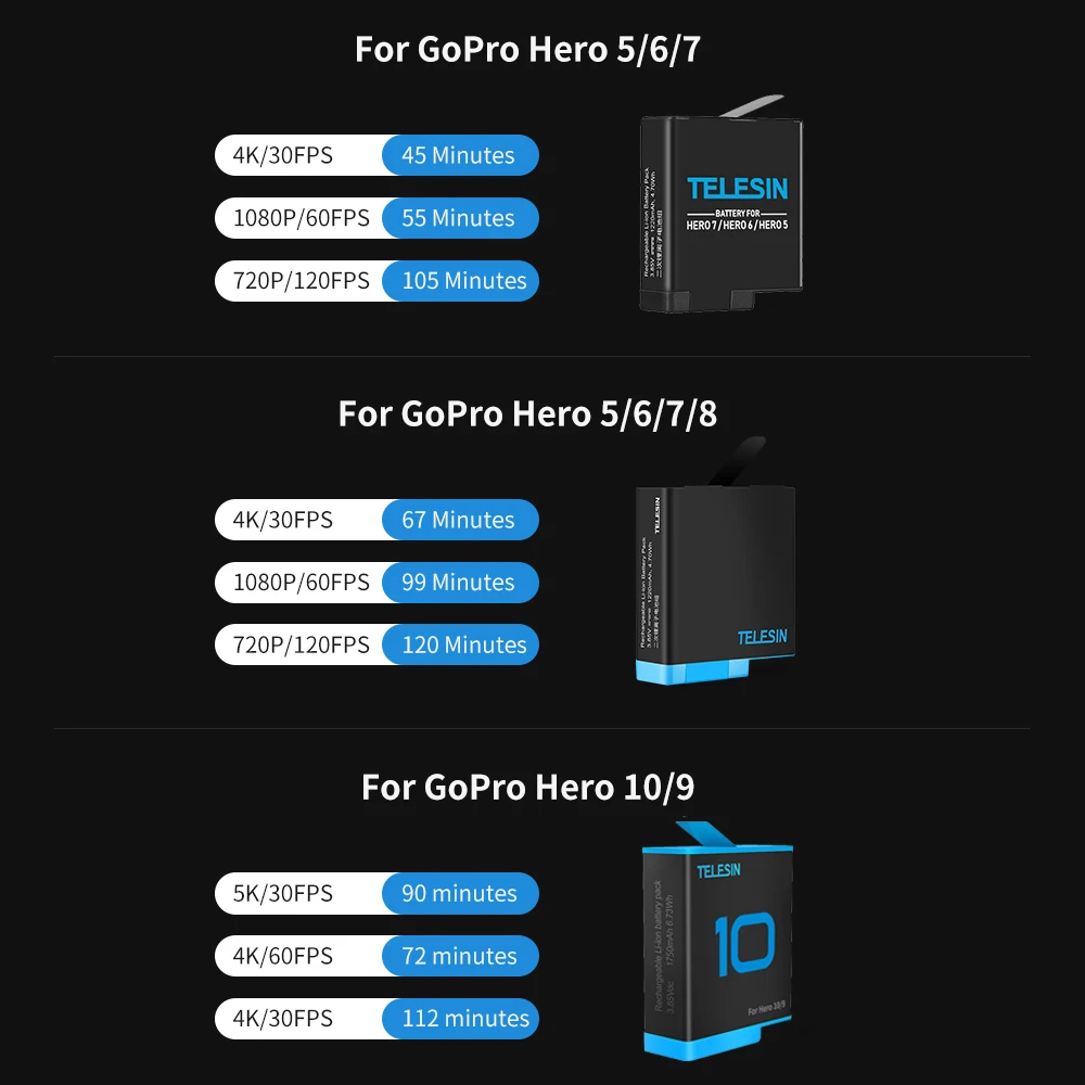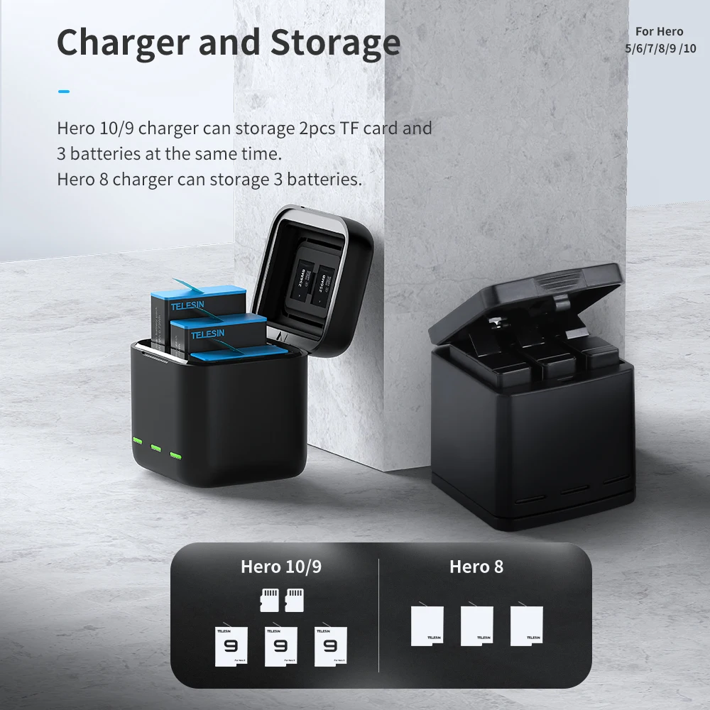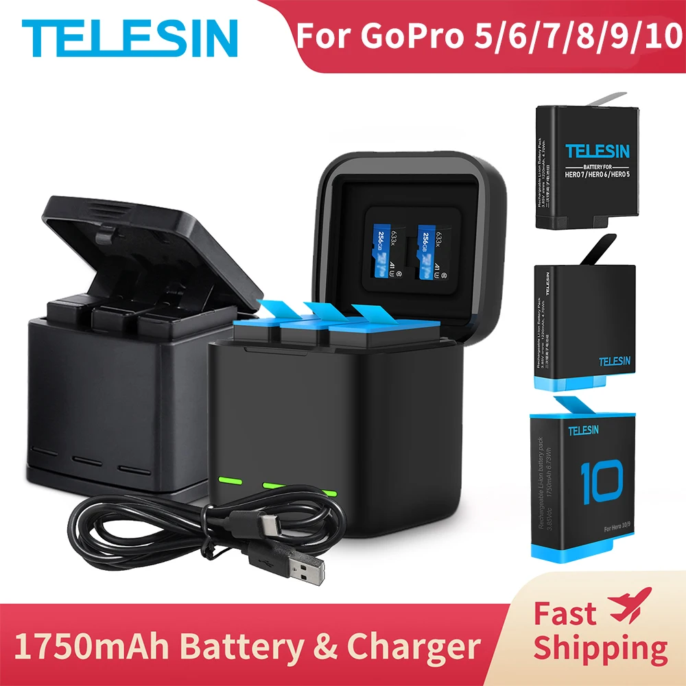 Зарядное устройство TELESIN для GoPro 10 9, 1750 мА ч, 1220 мА ч, 3 слота