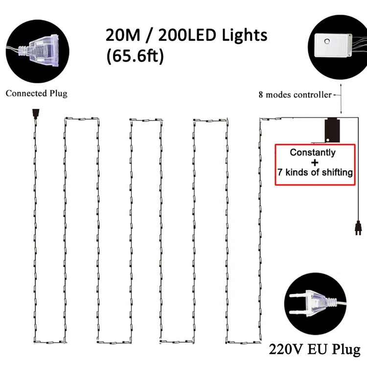 • [Яркость и тепло] наш светодиодный светильник на Рождество использует светодиодный светильник высокой яркости, каждый кристально чистый светодиодный светильник светится с углом обзора 360 градусов. Этот светильник очень теплый, мягкий и не ослепляющий, добавляя классический и очаровательный светильник к вашему рождественскому украшению• [8 режимов освещения с функцией памяти] 8 режимов для различных случаев и настроений, создавая уникальные атмосферы. Будь то романтическая годовщина, веселое Рождество или сюрпризы для ваших близких, эти сказочные гирлянды сделают трюк! Чтобы переключиться между режимами освещения the8, вам нужно всего лишь нажать кнопку на адаптере. Встроенный чип памяти сохраняет последний режим настройки, нет необходимости перезагружать режим каждый день• [Широко используется] светильник с рождественской елкой длиной 65,6 футов (20 метров) с 200 светодиодными лампами идеально подходит для использования в помещении и на открытом воздухе. Прозрачная проволока может скрывать внутри гирлянды, рождественскую елку и многое другое. Он также может сочетаться с любым фоном, очень подходит для комнаты, стены, сада, крыльца или добавления сверкающего свечения в ваш патио или балкон, что делает каждый уголок новым.• [Водонепроницаемость IP44] Наши водонепроницаемые рождественские гирлянды прошли сертификацию IP44. Все мини-светодиодный лампы-это светодиодный светильник fil с клейкими Слоями Горячего Расплава, защита от замерзания и окисления обеспечит более длительный срок службы. Идеально подходит для использования на открытом воздухе без повреждений, включая сильный дождь и снег. Но обратите внимание, что адаптер nad должен быть защищен от водыОбратите внимание:1. Если вы используете их на открытом воздухе, оберните вилку и адаптер в полиэтиленовый пакет, чтобы предотвратить попадание воды. Огни и шнуры водонепроницаемы, но они не должны замачиваться в воде.2. Фактическая длина может быть менее 65,6 футов (20 метров), но не менее 63 футов (19,2 метров).