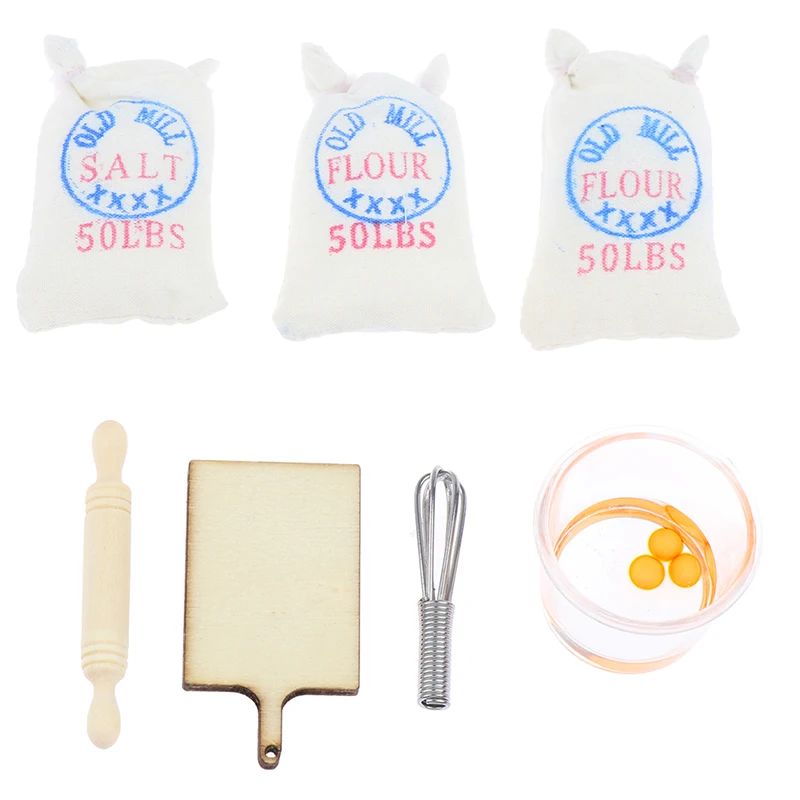 Размеры: муки, мешок для муки, мешок для соли, Скалка, разделочная доска около 45 мм; Устройство для взбивания яиц: 37 мм, яичная миска: 3*2,5 см