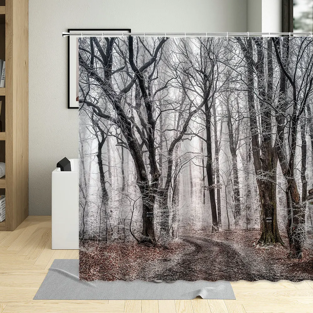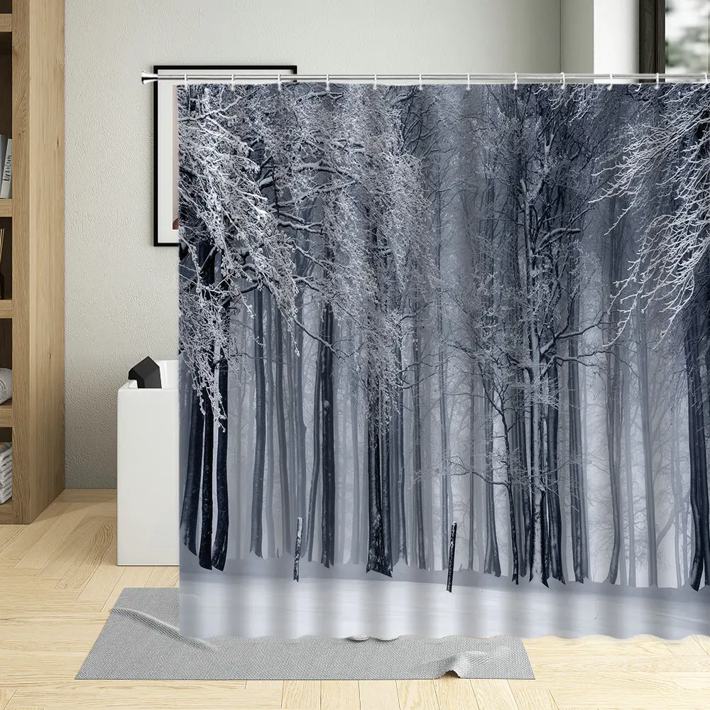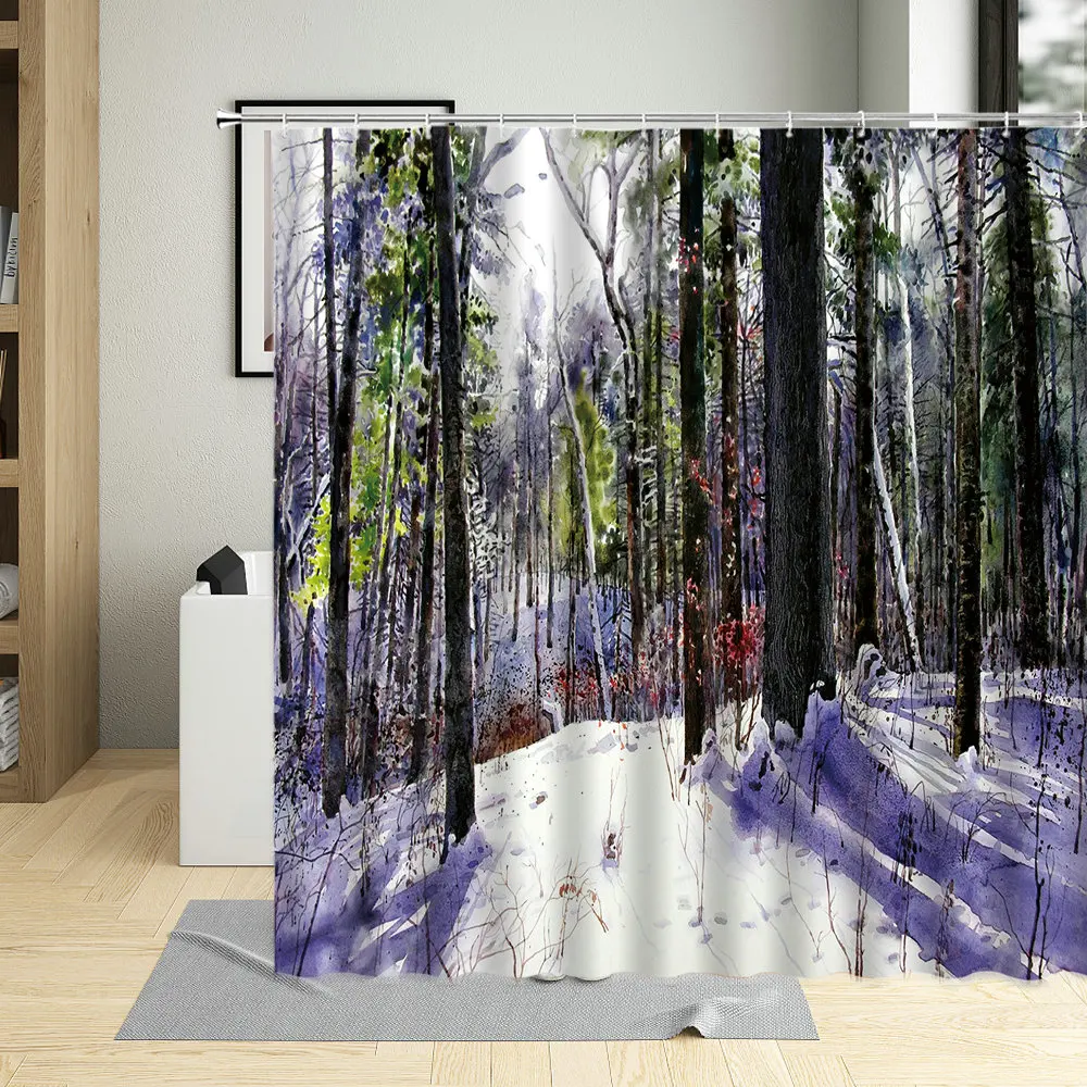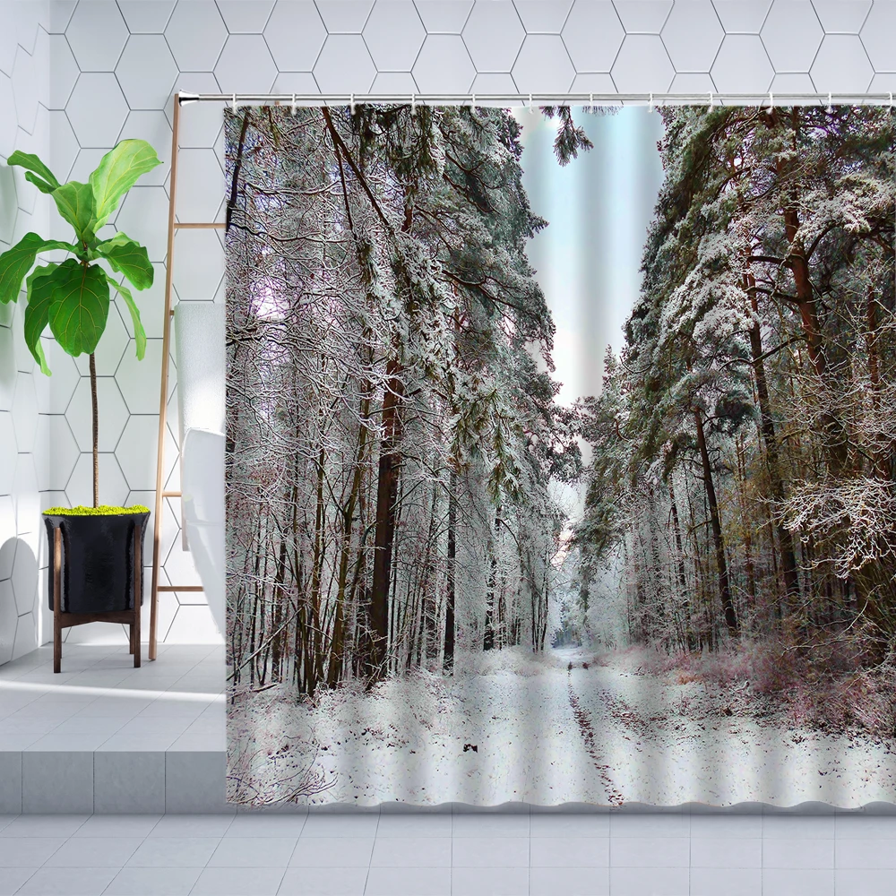 Зимняя душевая занавеска в комплекте, лес, пейзаж, дерево, багажник...