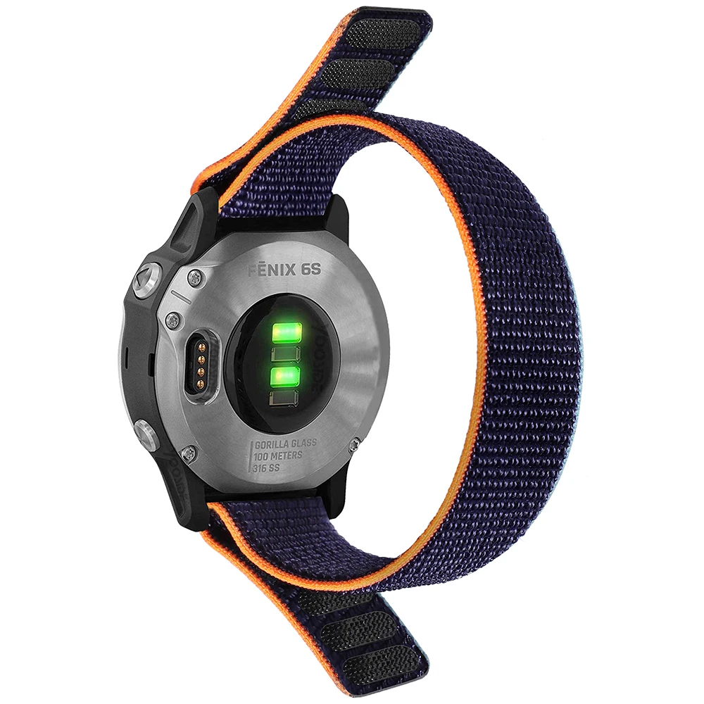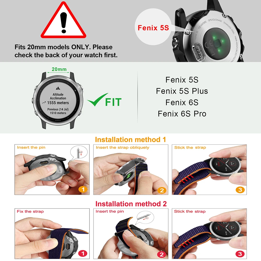> 20 мм нейлоновый тканевый ремешок совместим с Garmin Fenix 5S Plus, Fenix 5S,Fenix 6S,Fenix 6S Pro,D2 Delta S smartwatch.> Уникальная конструкция крючка и петли гарантирует, что два конца прочно прикреплены к ремешку, достаточно безопасно и легко устанавливается.> Дизайн без пряжки и цельный Объемный дизайн делают ремешок часов легче и удобнее, комфортнее, лучше для мониторинга сердечного ритма.> Воздухопроницаемый нейлоновый материал моющийся, легкий, жесткий и мягкий, особенно подходит для бега, плавания, йоги, велоспорта, различных видов спорта на открытом воздухе.> Легко отрегулировать размер без инструмента. Подходит для запястья 5,11-8,47 дюйма (130 мм-215 мм).