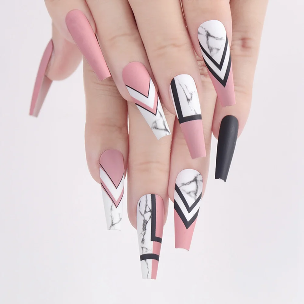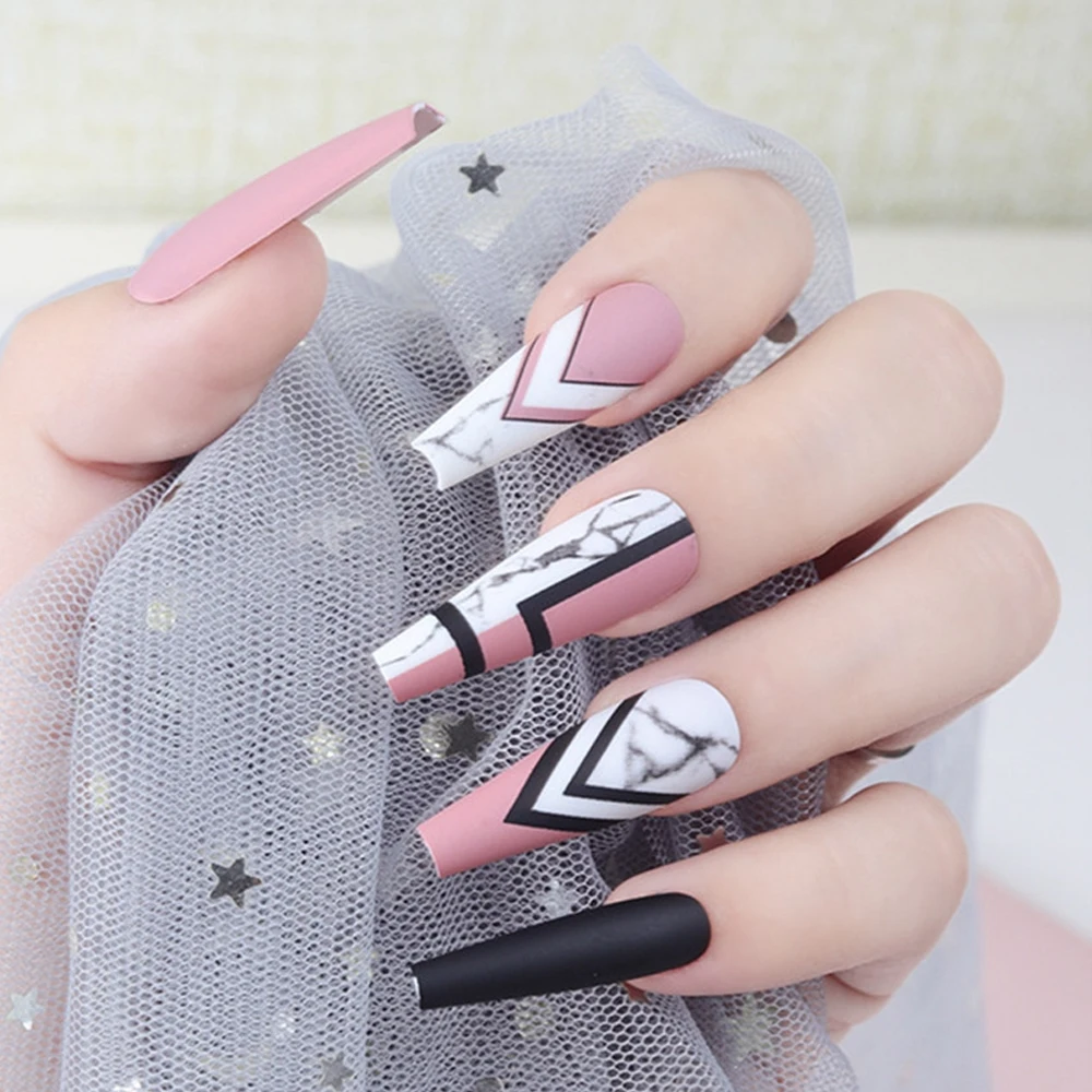 Мраморный узор Длинные балетные накладные ногти с линейным дизайном съемный Гроб Дизайн ногтей носимые накладки для Ногтей пресс на ногти маникюр
